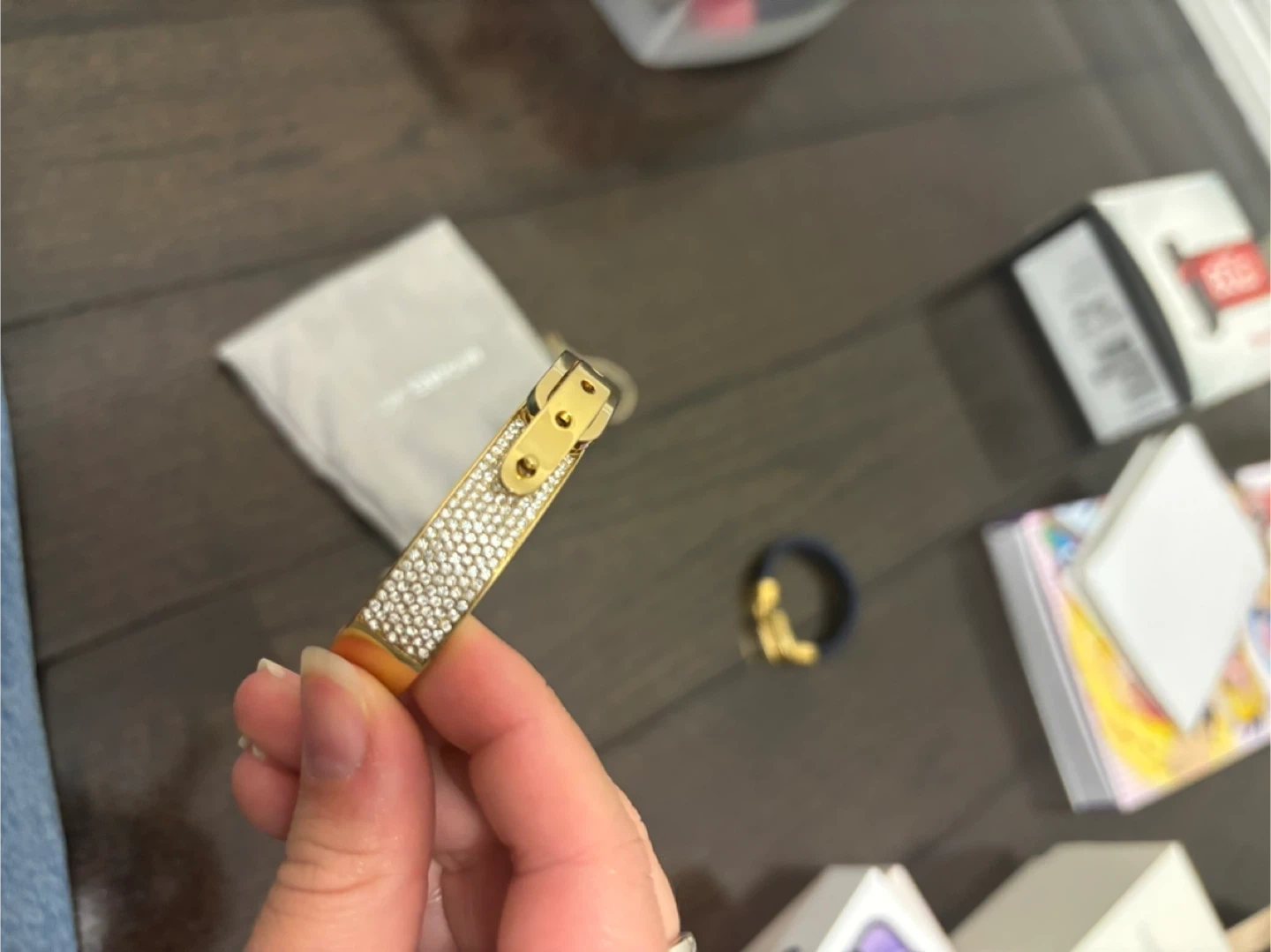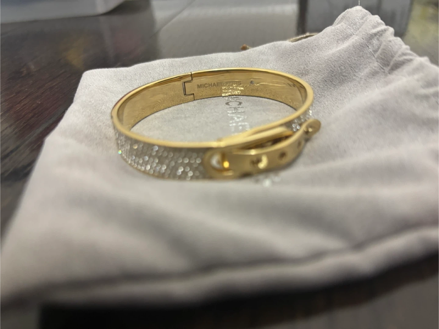 63Michael Kors gold-tone bangle bracelet! It has a buckle design and sparkly stones. Comes with its original dust bag Hardly worn!