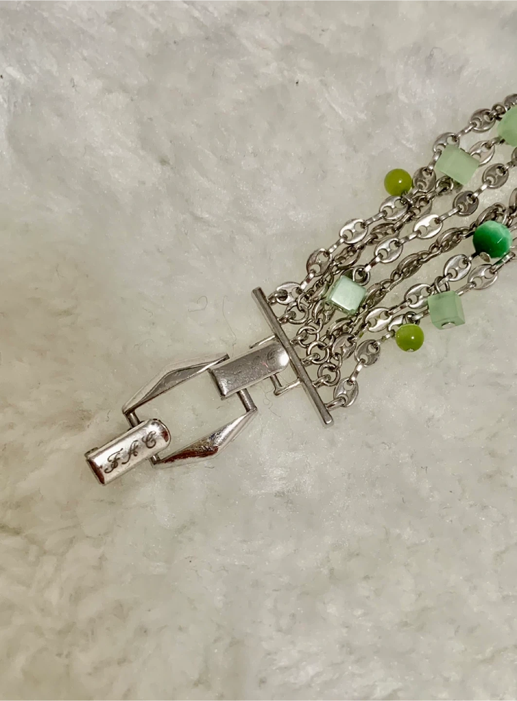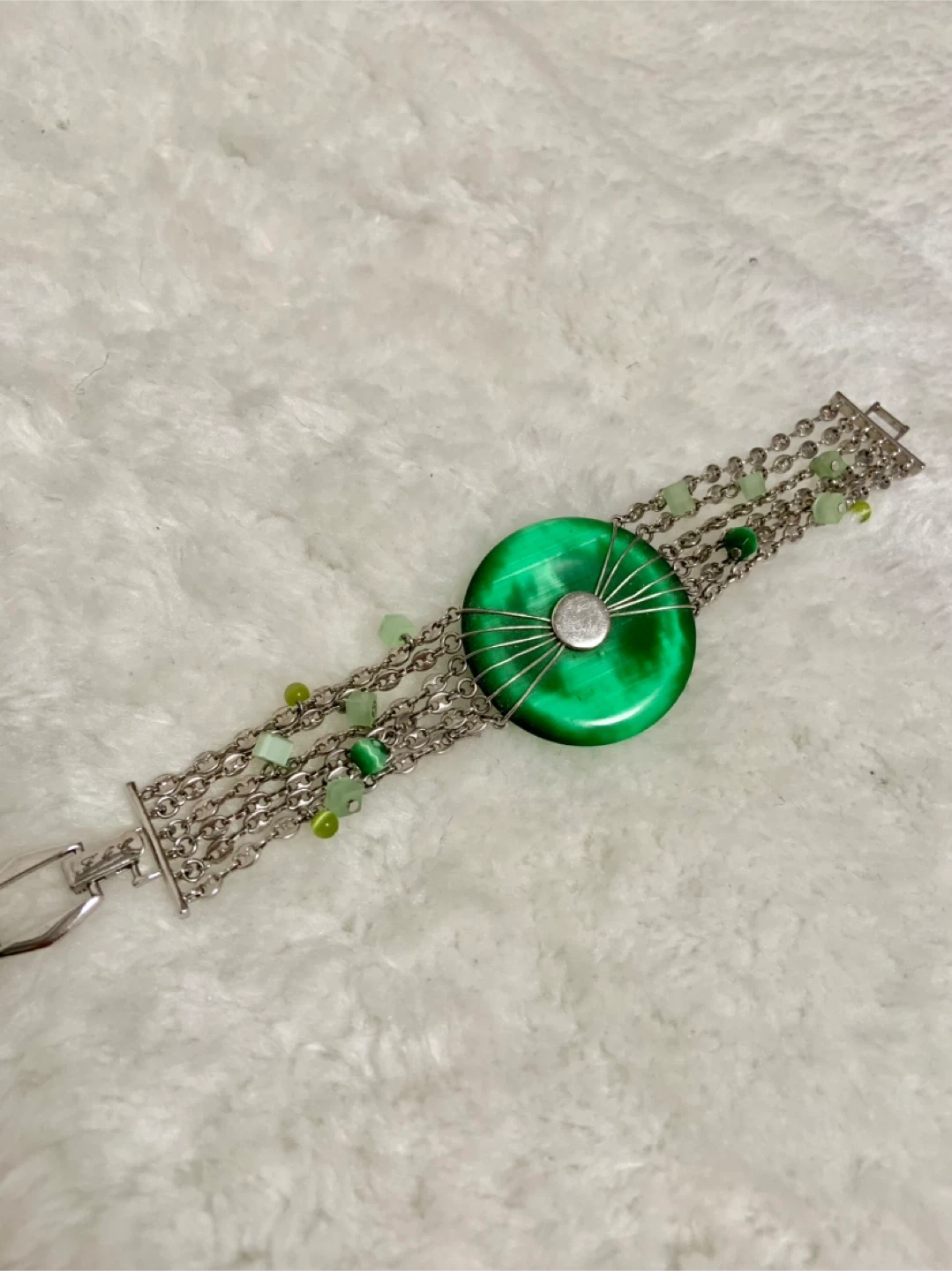 Selling a vintage Fifth Avenue Collection bracelet with a green Resin Donut Bead and silver-tone metal chains. The bracelet is about 7.5 inches long.