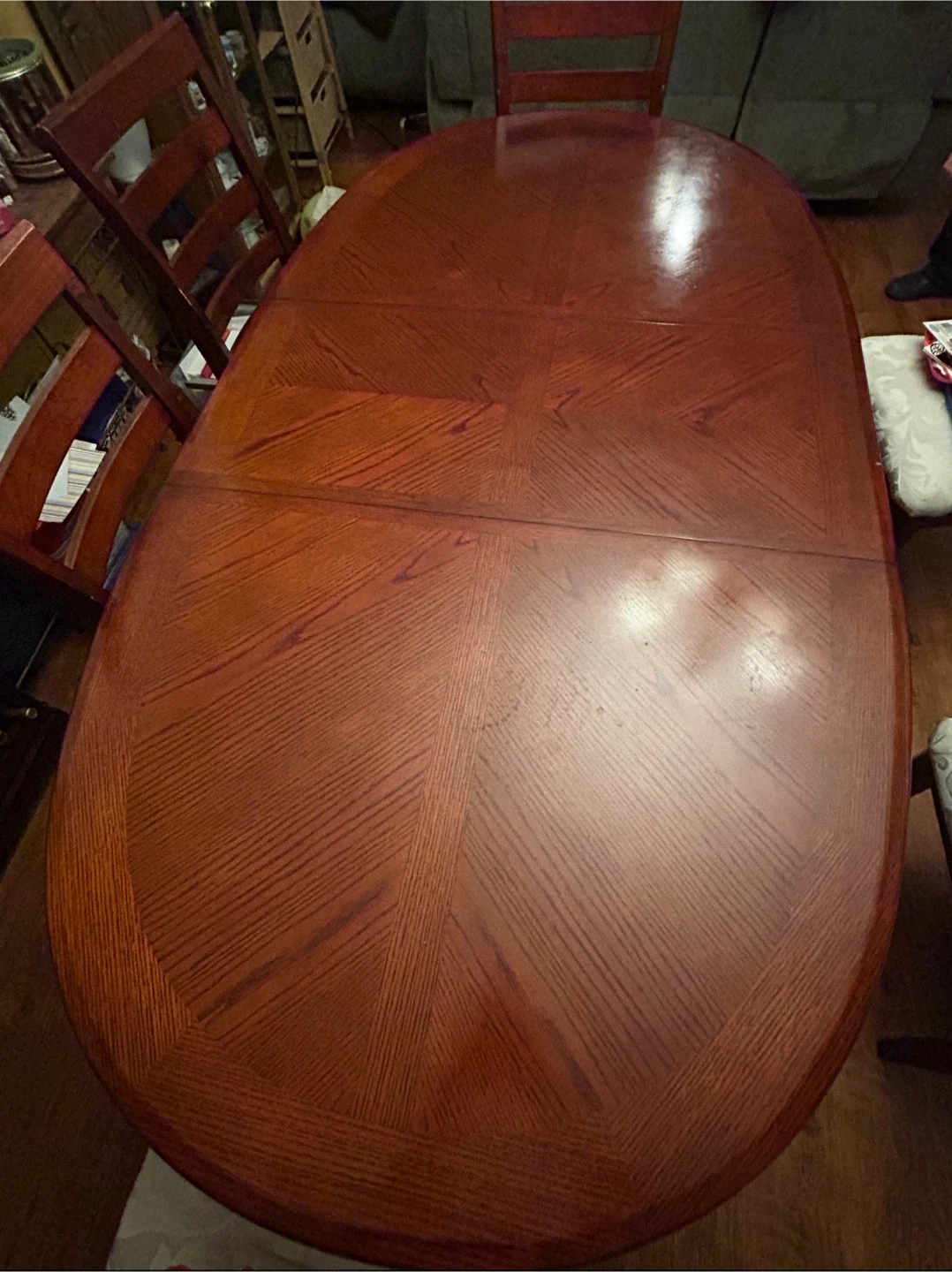 This is a lovely wooden dining table, perfect for family dinners or gatherings! It has a rich, warm tone and a unique patterned surface. It's in good condition and ready to be the centrepiece of your dining room