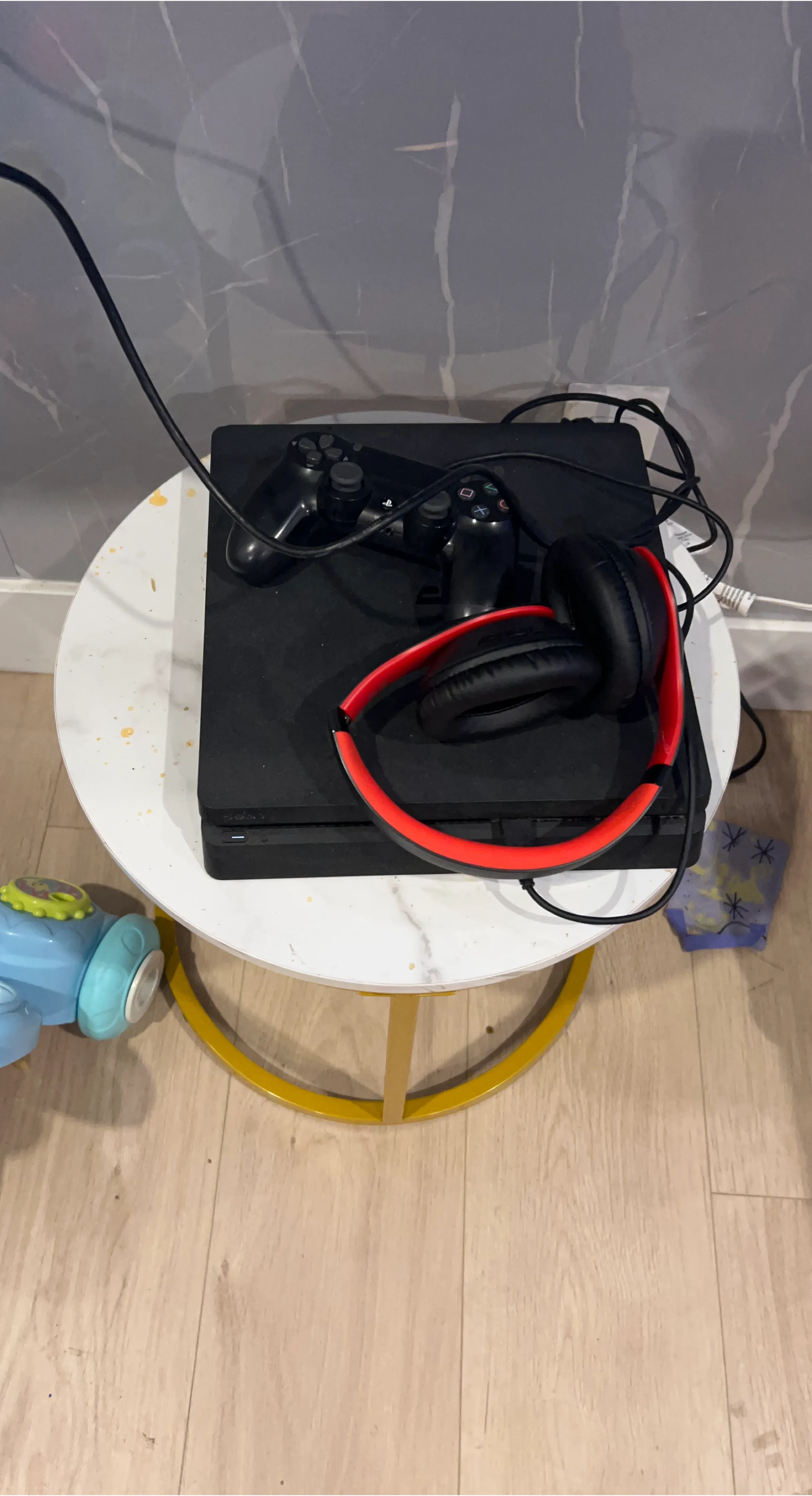 Selling a used PlayStation 4 console with a controller and a pair of headphones. Everything is in good working condition and ready for a new home!