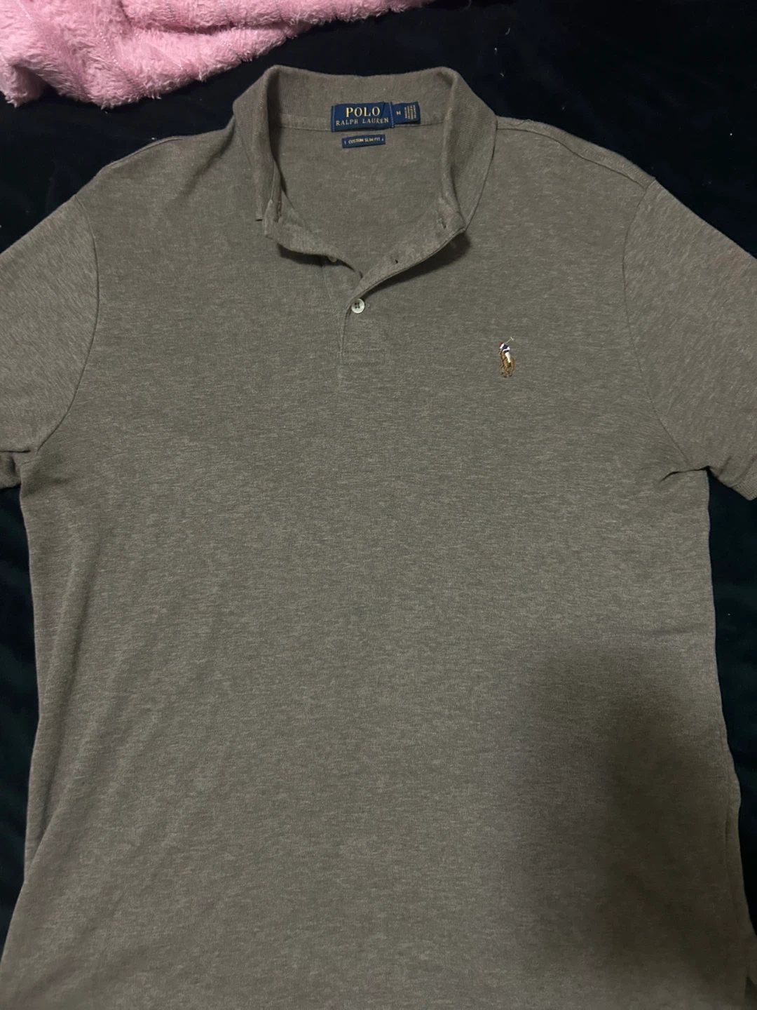 Selling a Polo Ralph Lauren polo shirt in size medium. It's a custom slim fit and in great condition. The colour is a neutral grey-brown shade. Perfect for a casual look!