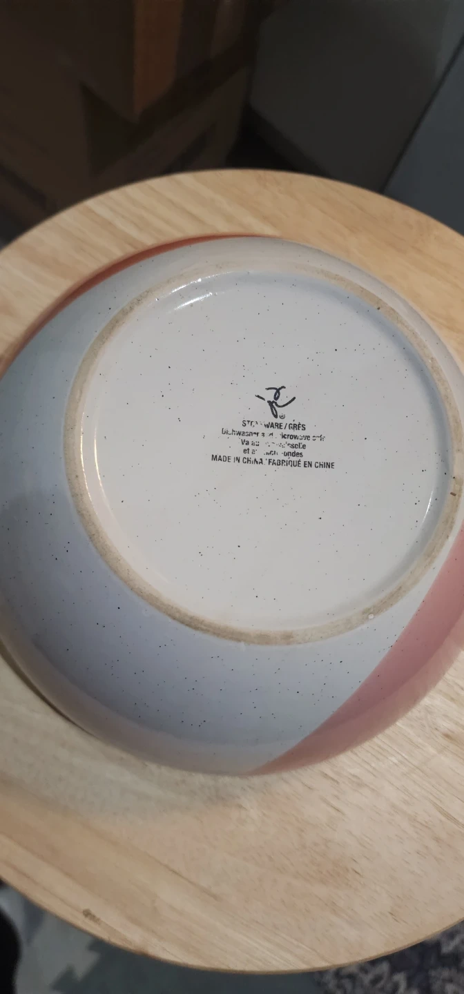 Selling a lovely stoneware bowl featuring a stylish blend of pink, white, and grey. It's in great shape and would be a nice addition to any kitchen or dining space