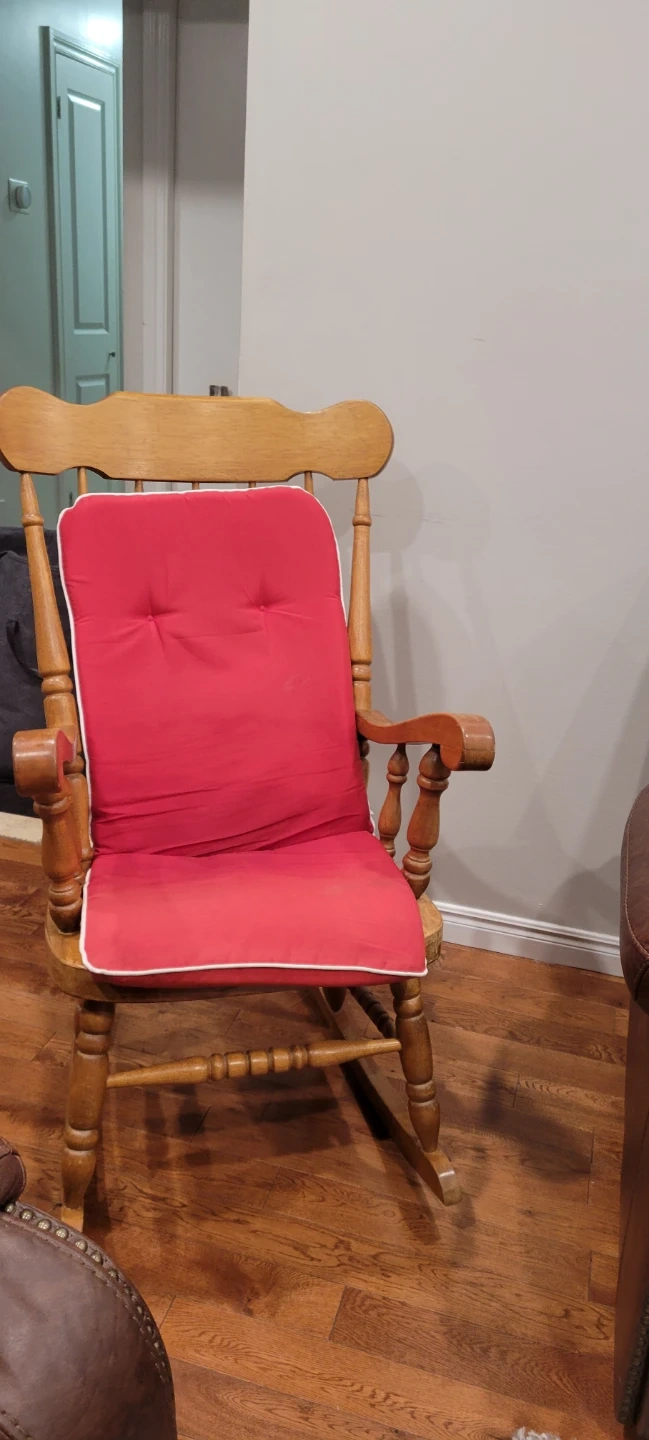 Here's a classic wooden rocking chair that would look great in any home! It comes with a comfy red cushion. Perfect for relaxing after a long day