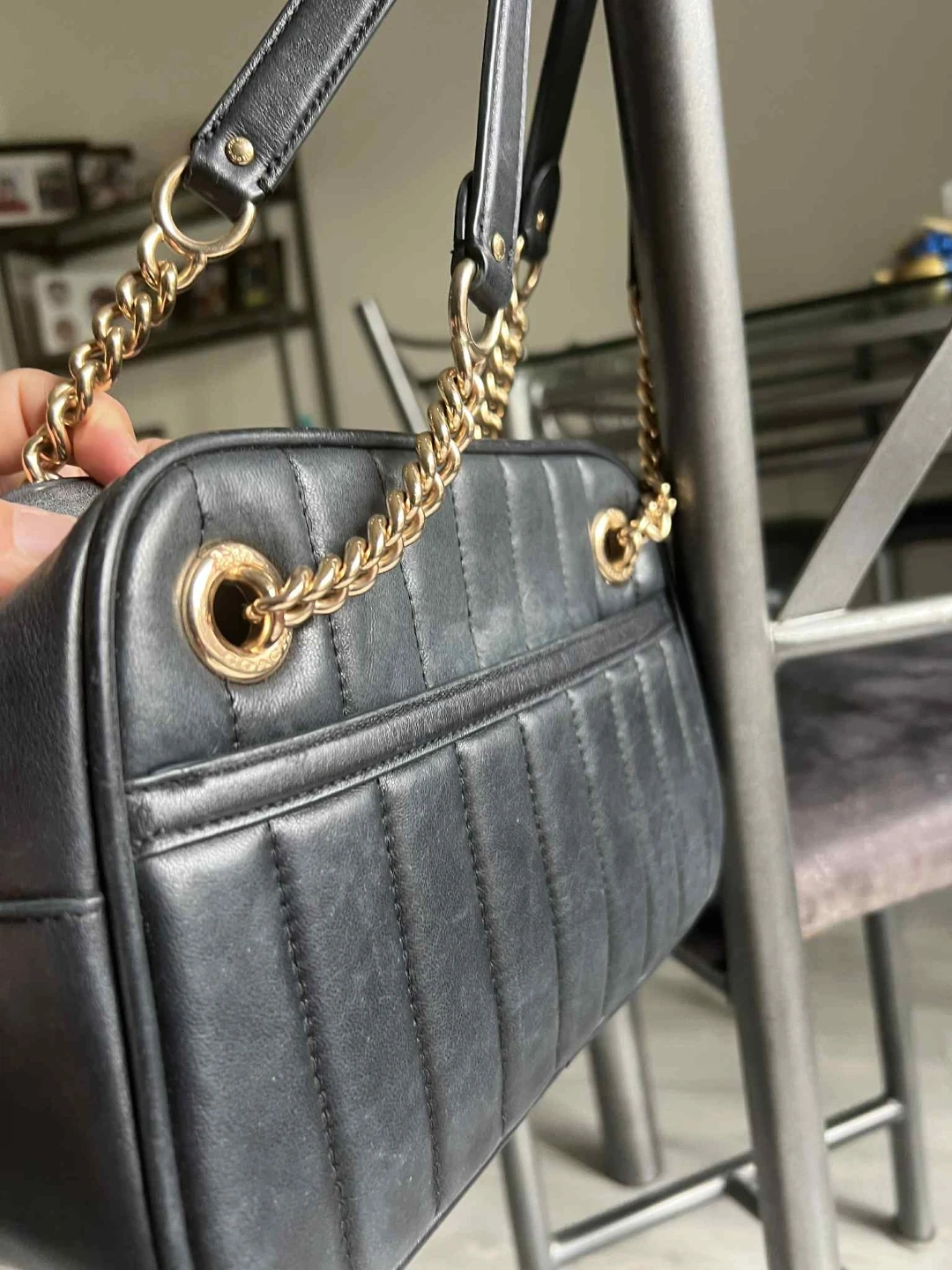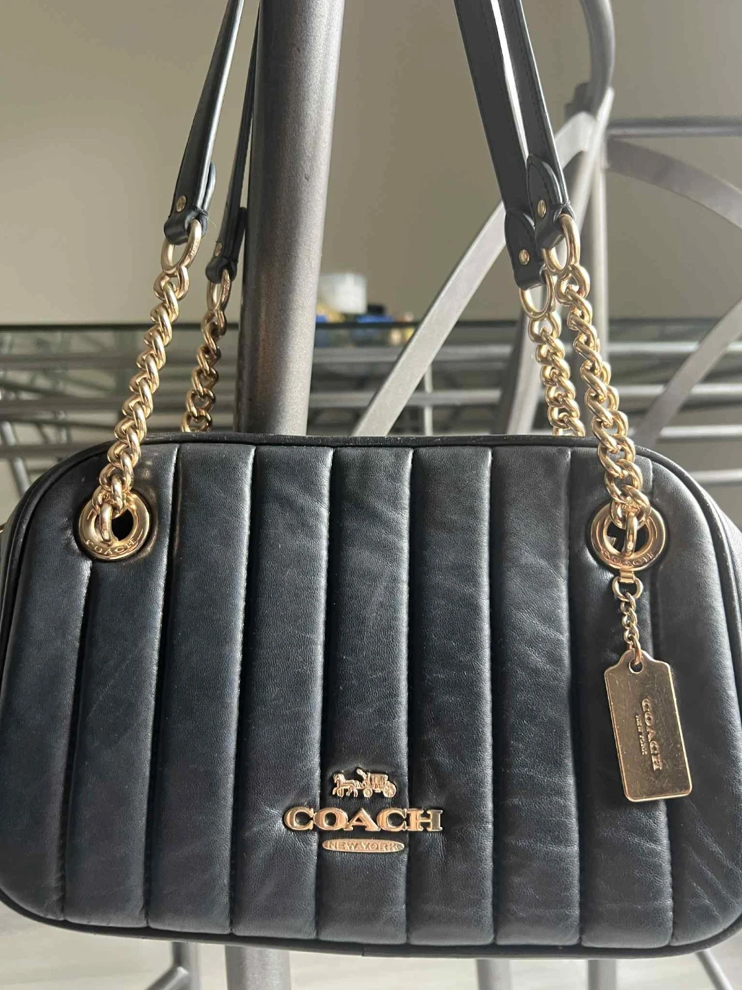 This is a stylish Coach shoulder bag in black leather. It features a gold chain strap and the classic Coach logo. It's in good condition and perfect for everyday use! Very elegant brought it in cross iron for over 300