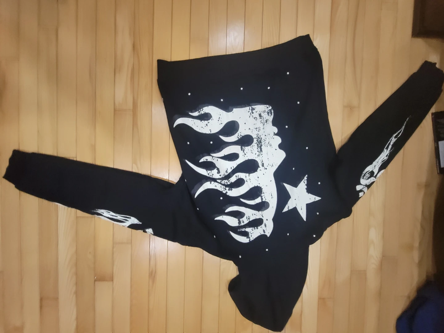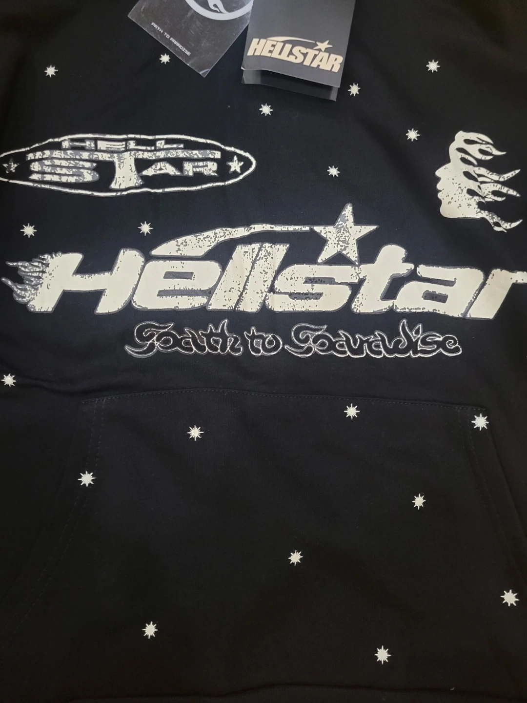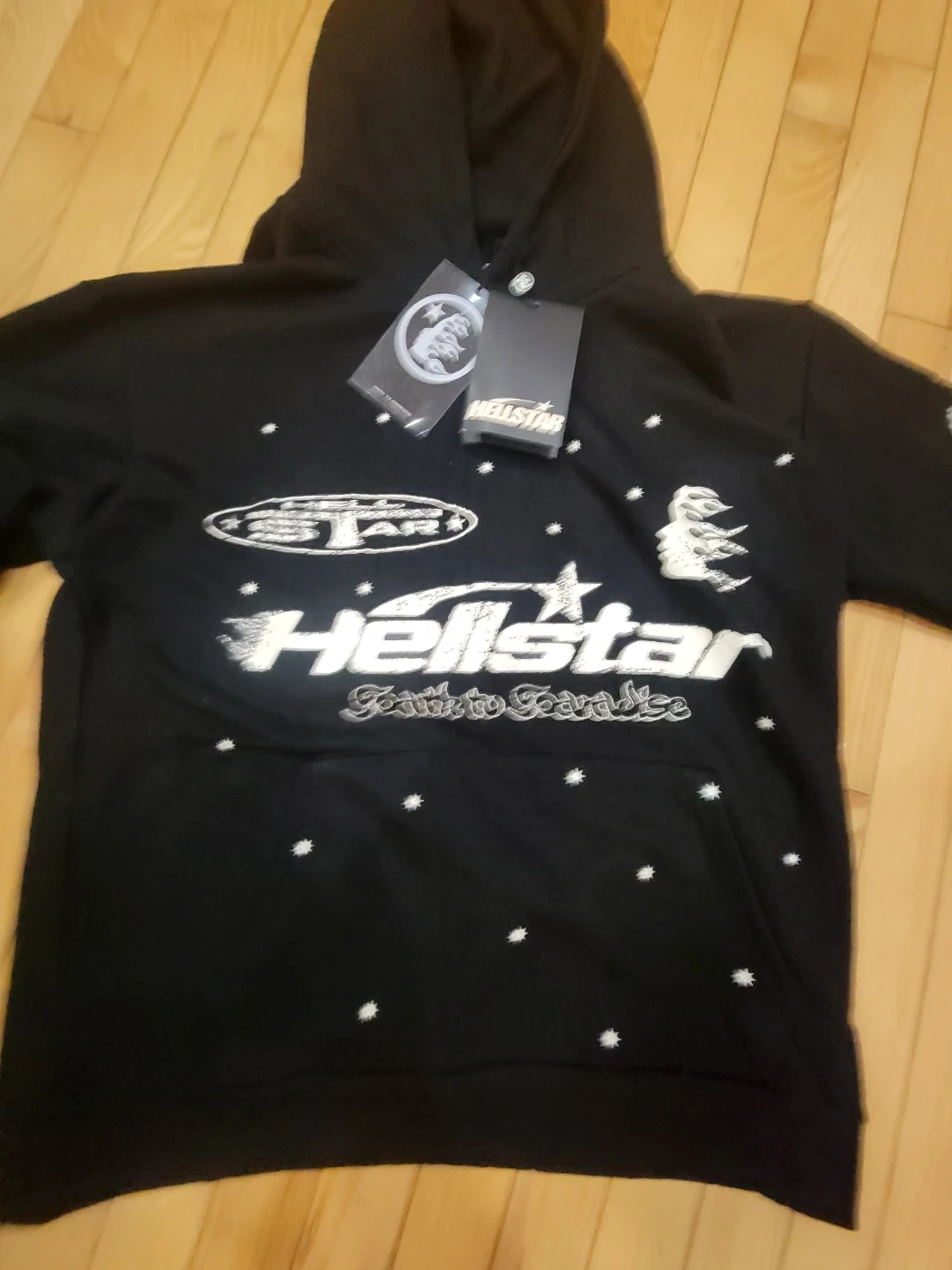 Selling a Hellstar Path to Paradise hoodie in black. It's in new condition with tags still attached! The hoodie features unique graphics on the front, back, and sleeves. Perfect for anyone who loves streetwear fashion