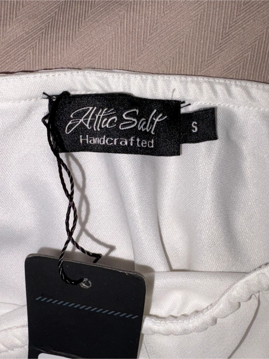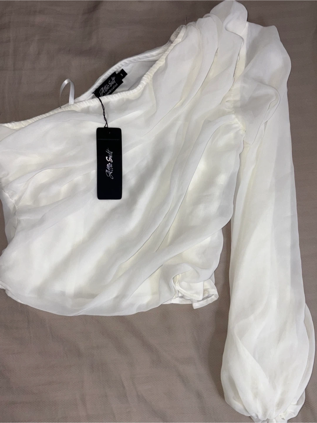Selling an Attic Salt one-shoulder blouse in white. It's a size small and looks great! The fabric is lightweight and flowy.