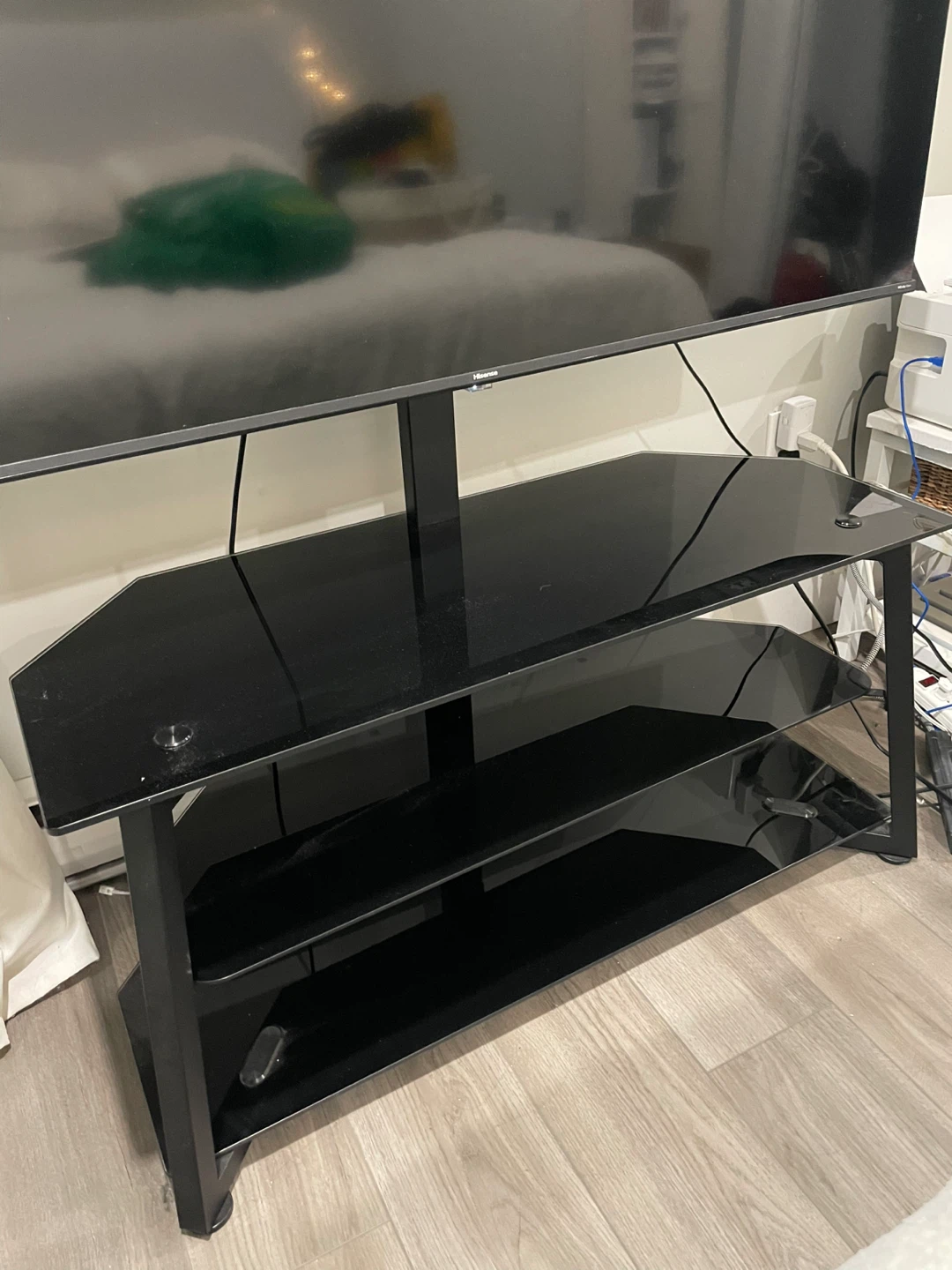 Selling a sleek black glass TV stand. It has three shelves for media components or decor. Great for any living room setup!