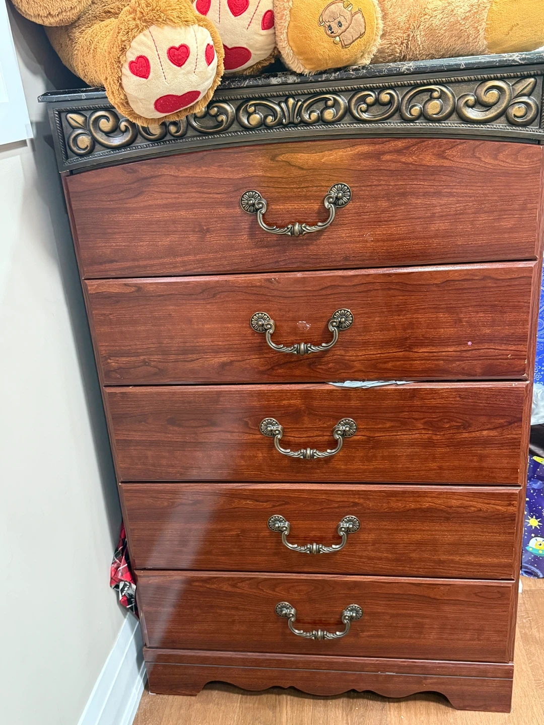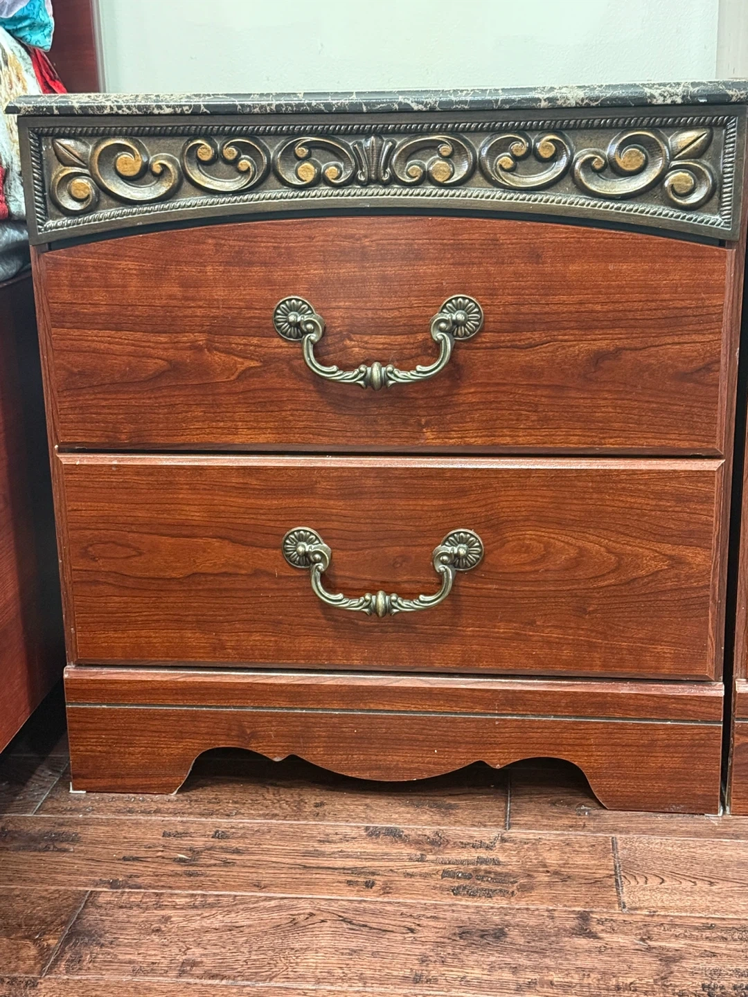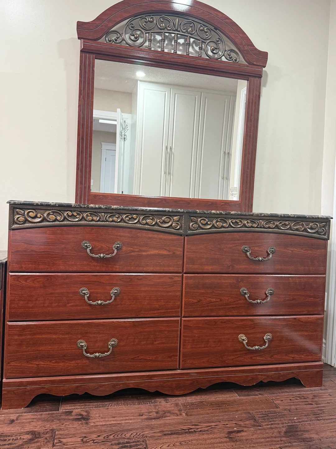 Selling a bedroom set including a dresser, nightstand, and bed frame. The pieces are a matching set with a classic design and a rich, warm wood finish. The dresser has multiple drawers for ample storage, and the nightstand provides a convenient surface next to the bed. The bed frame is sturdy and stylish, completing the look of the set. Great for adding a touch of elegance to your bedroom!