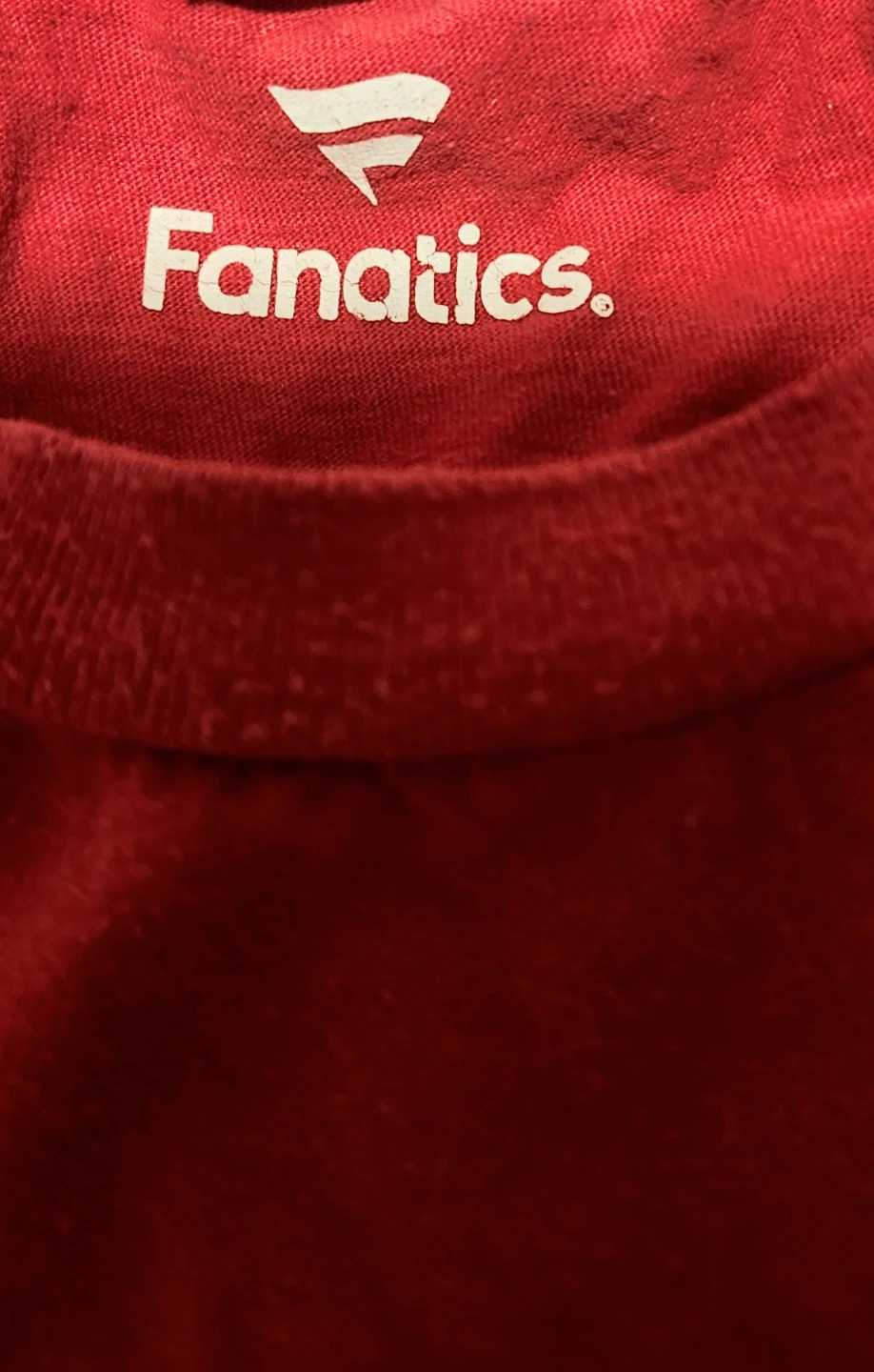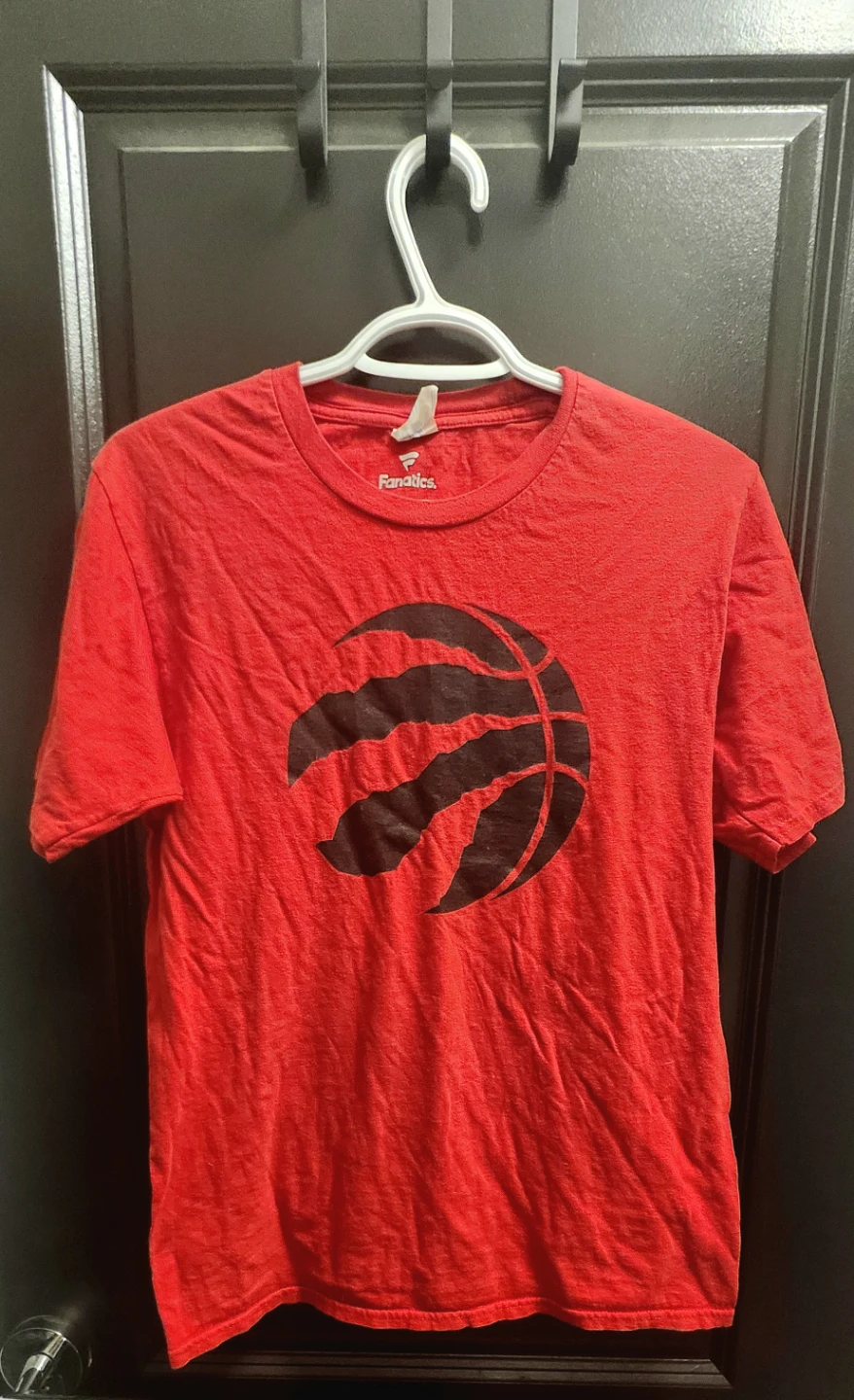 Show your support for the Toronto Raptors with this Fanatics red T-shirt, size small! This used T-shirt is in good condition and features the iconic Raptors logo, perfect for game days or casual wear.