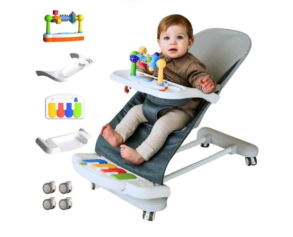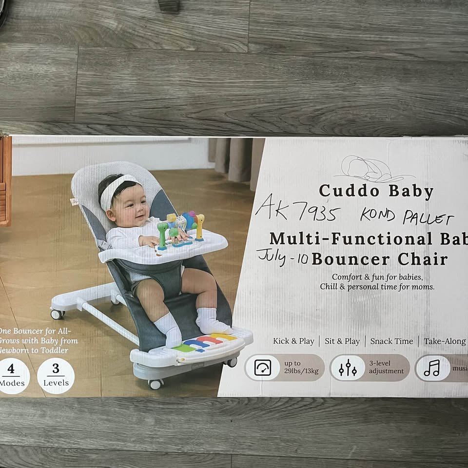 Used like new CuddoBaby 4-in-1 baby bouncer on wheels with detachable piano and feeding tray. Features a 3-level recline, foldable seat with play bar for infants to toddlers up to 29 lbs.