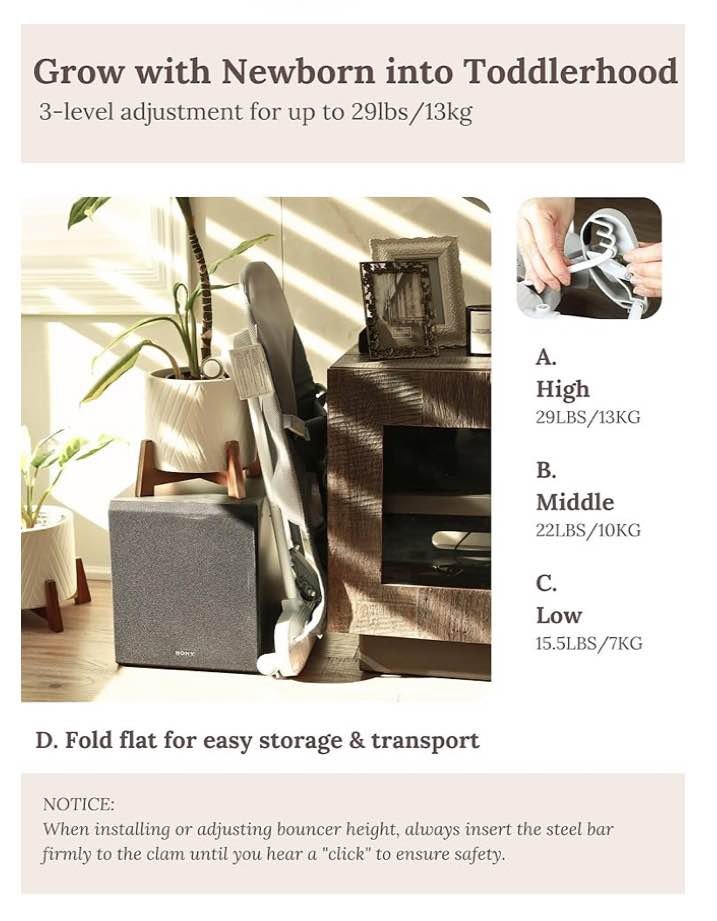 Customize for your baby’s growth with 3 adjustable angles to accommodate infants up to toddlers (29 lbs / 13kg) from relaxation, playtime and interaction, to feeding or sitting up. Experience the convenience of folding the bouncer flat in a snap, allowing for easy storage in limited spaces, like your car trunk for travel.