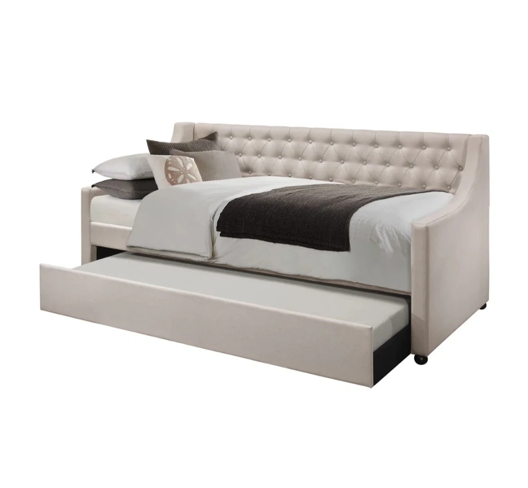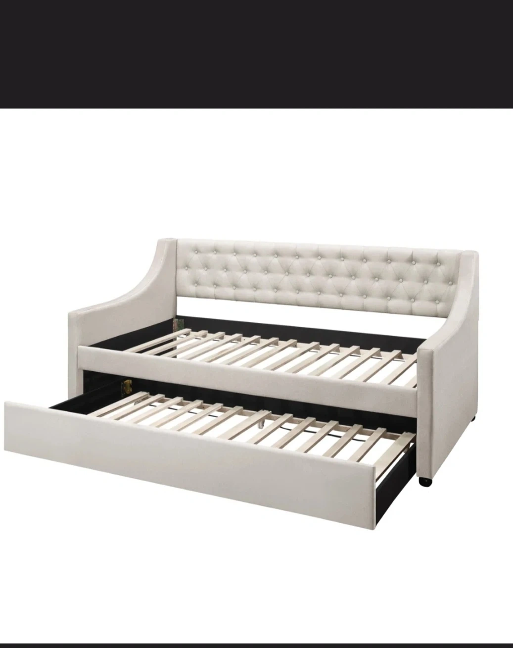 Selling a daybed with a trundle in a neutral beige color. It's a great piece for a guest room or living area, offering extra sleeping space when needed. The daybed features a tufted back and clean lines, making it a stylish addition to any home. The trundle easily rolls out, providing an additional bed for guests or sleepovers