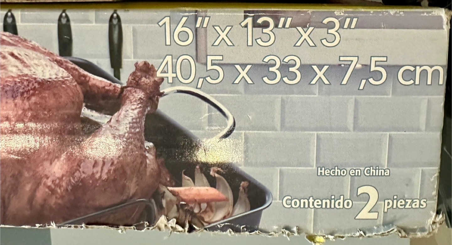 Selling a brand new T-fal turkey roasting pan still in its original box! The dimensions are 16" x 13" x 3" (40.5 x 33 x 7.5 cm).
