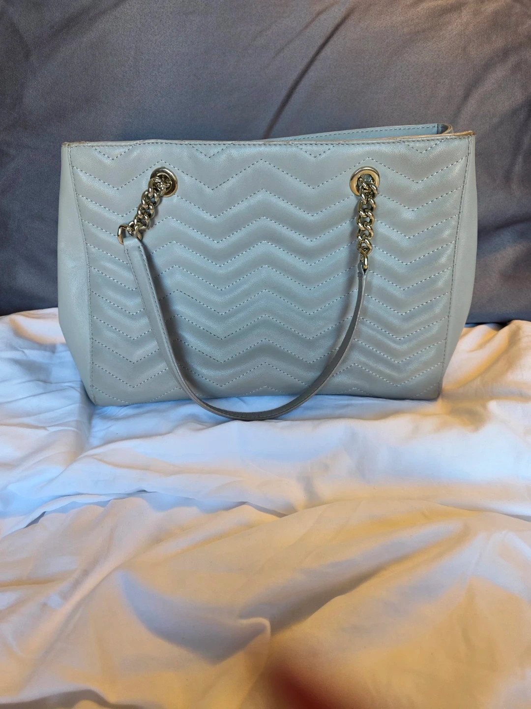 Crafted of quilted chevron leather, this bag features one center zip compartment, one interior zip pocket, and two slip pockets.