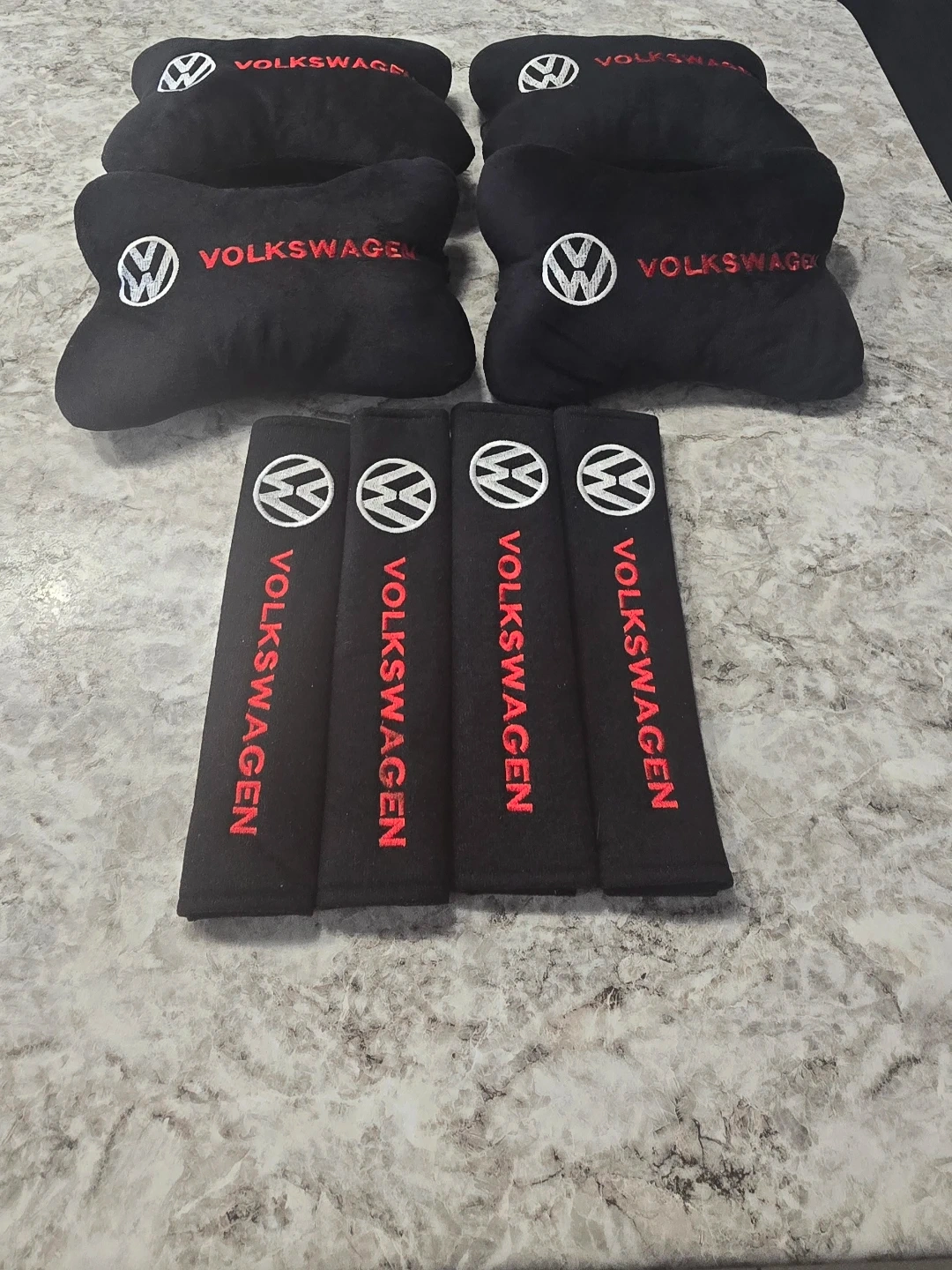 Volkswagen car neck rest pillow and seatbelt cover set. The set includes four neck rest pillows and four seatbelt covers, all in black with the Volkswagen logo embroidered in red and white. Perfect for adding a touch of style and comfort to your ride!