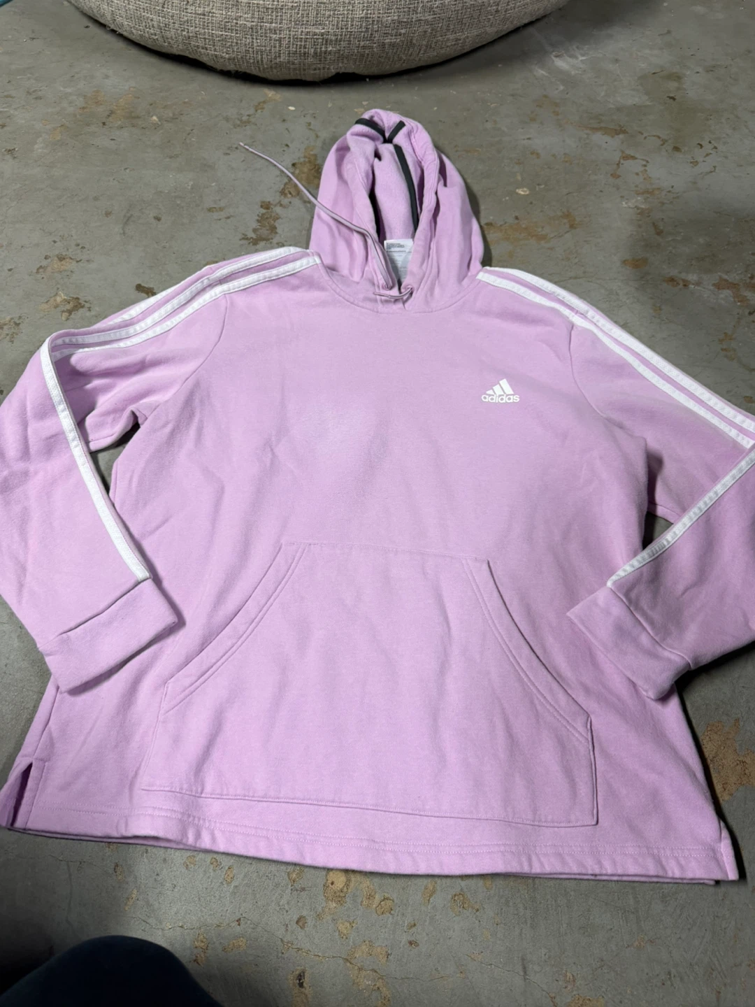 Selling a comfy Adidas hoodie in a lovely lavender colour. It features the classic three stripes on the sleeves and a kangaroo pocket in the front. Perfect for casual wear or workouts!