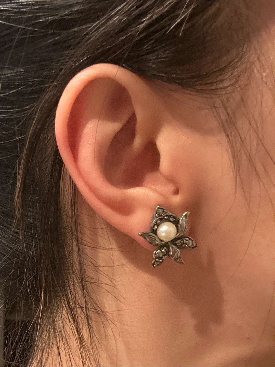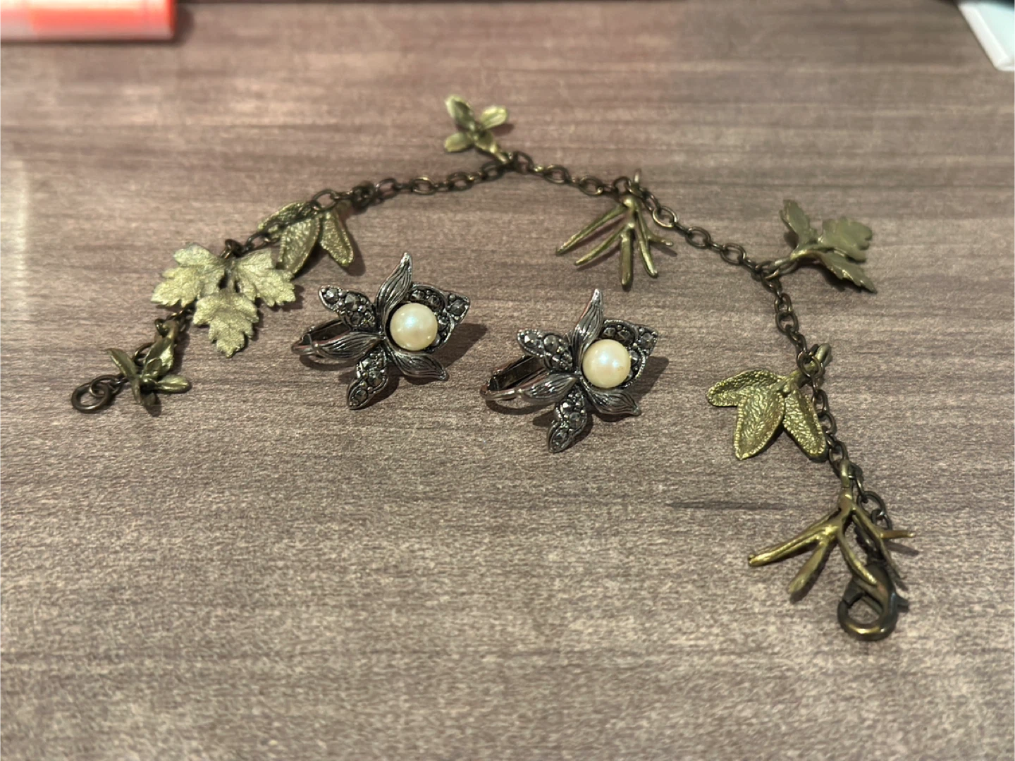 Selling a pair of vintage flower earrings with a pearl in the center and a plant-themed bracelet. Vintage in great condition
