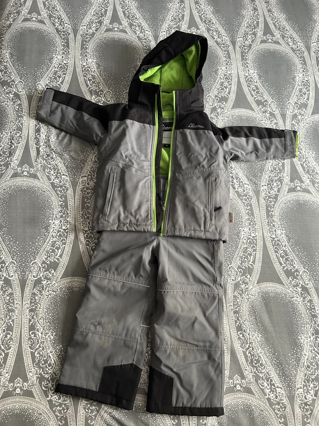 Selling a Storm Mountain kids' snowsuit in size 4. It's grey and black with a bright green lining. Perfect for keeping your little one warm and dry during winter activities!