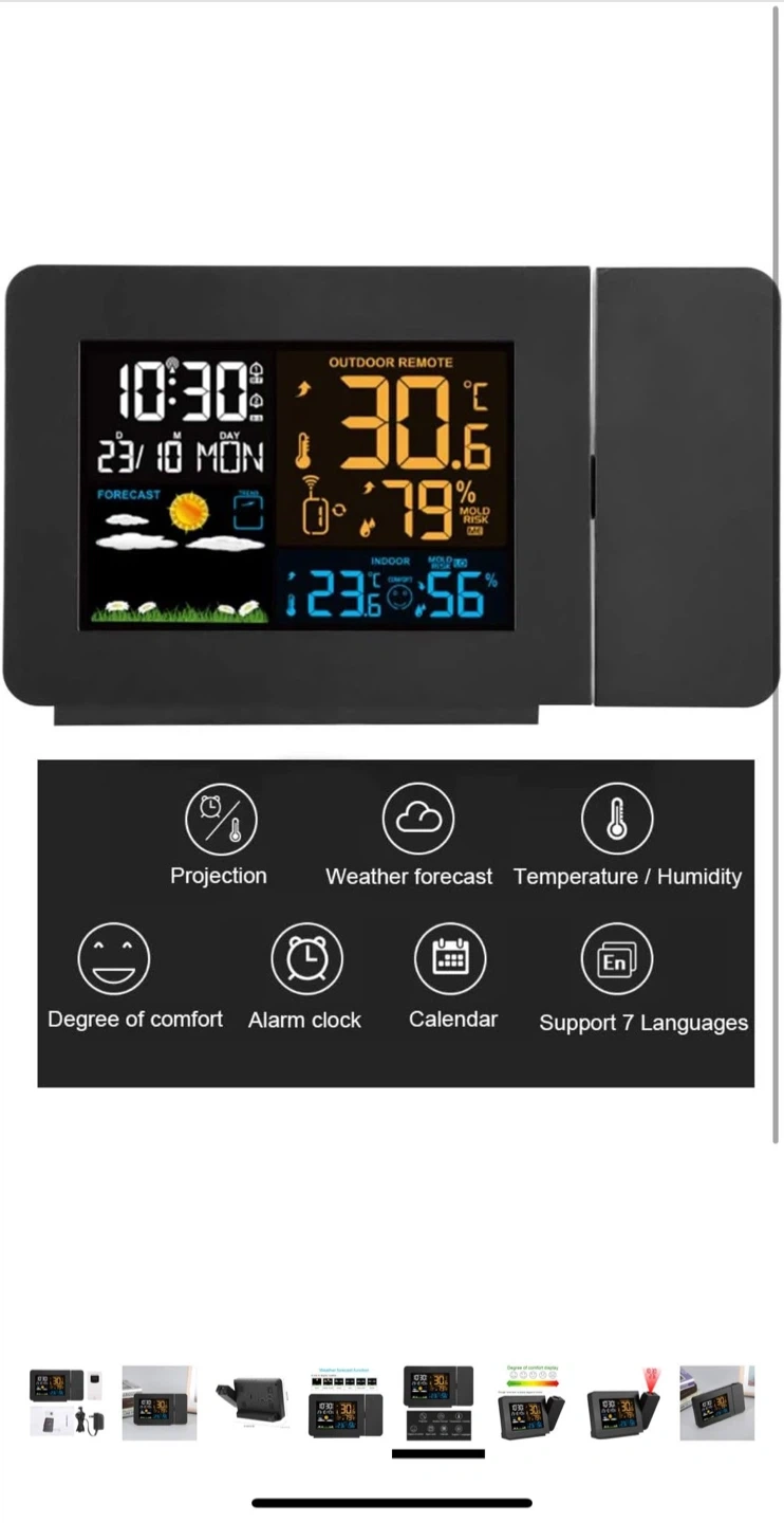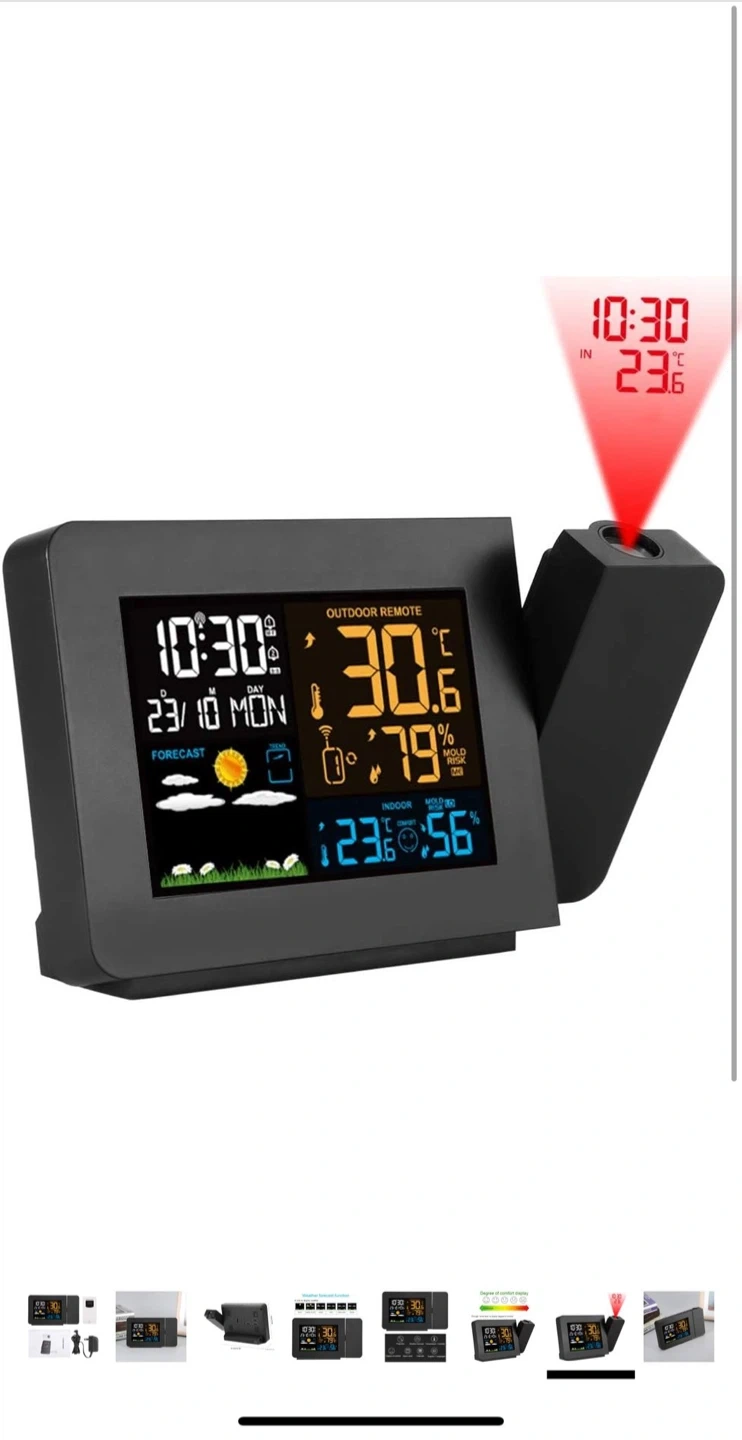 21Selling a wireless weather station that comes with an outdoor remote sensor! It displays the indoor and outdoor temperature, as well as the humidity. It also has a comfort level indicator to let you know if it's too hot or cold. The station also includes a projector to display the time on your wall or ceiling. Comes with the power adapter as well