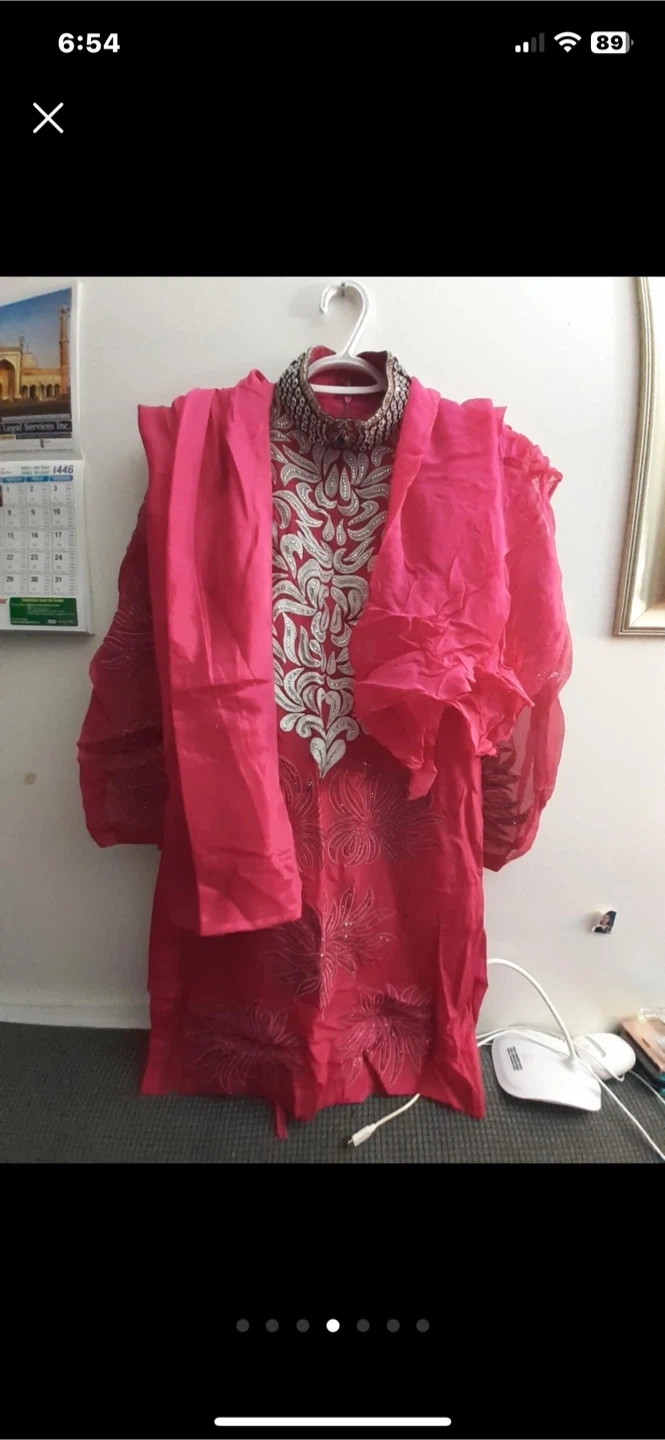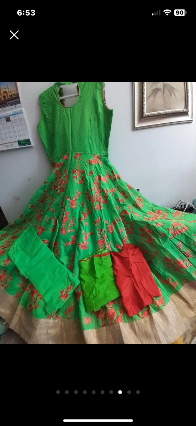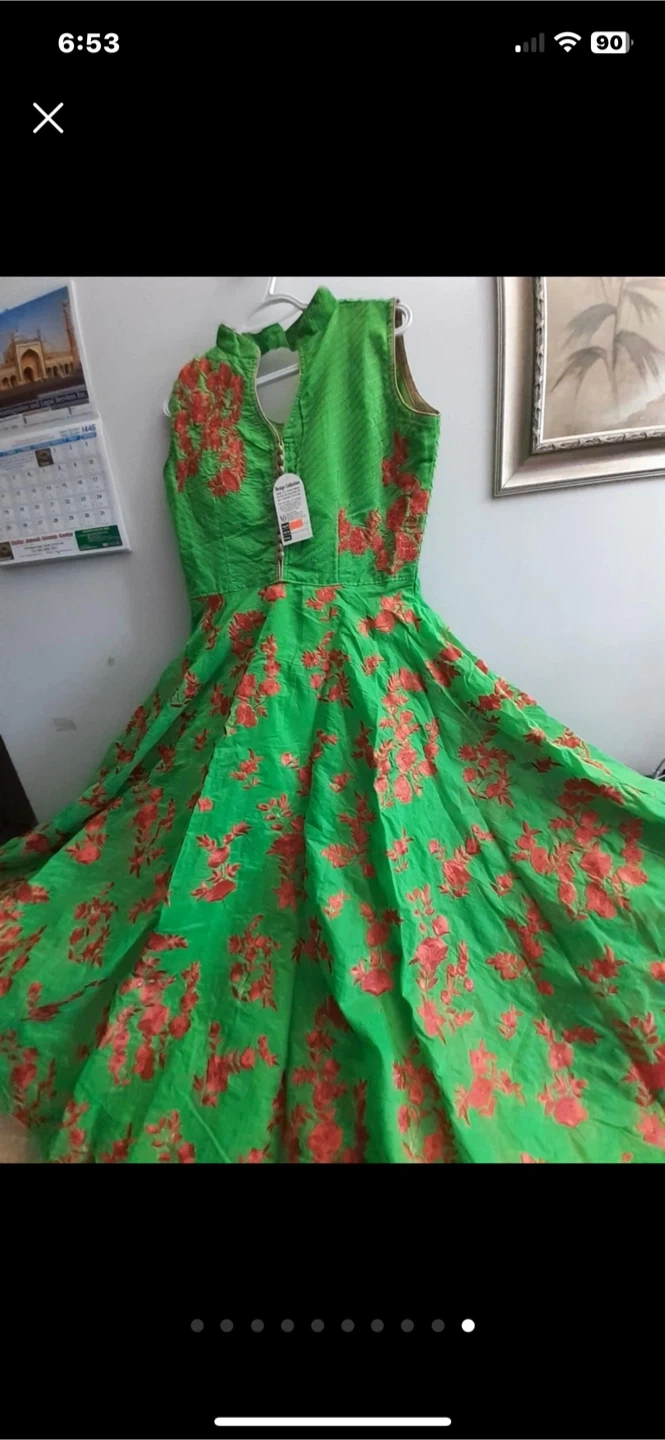 Selling a beautiful rose pink colour salwar kameez with intricate embroidery shifon material medium size $50 It comes with a matching dupatta. The dress is in good condition and perfect for special occasions! Parrots green colour with hot pink flowers embroidery long sleeve long gown brand new with tag free size long 54/55” dupian silk material $90 pick up at Markham and Lawrence no drop off check out my other listings please