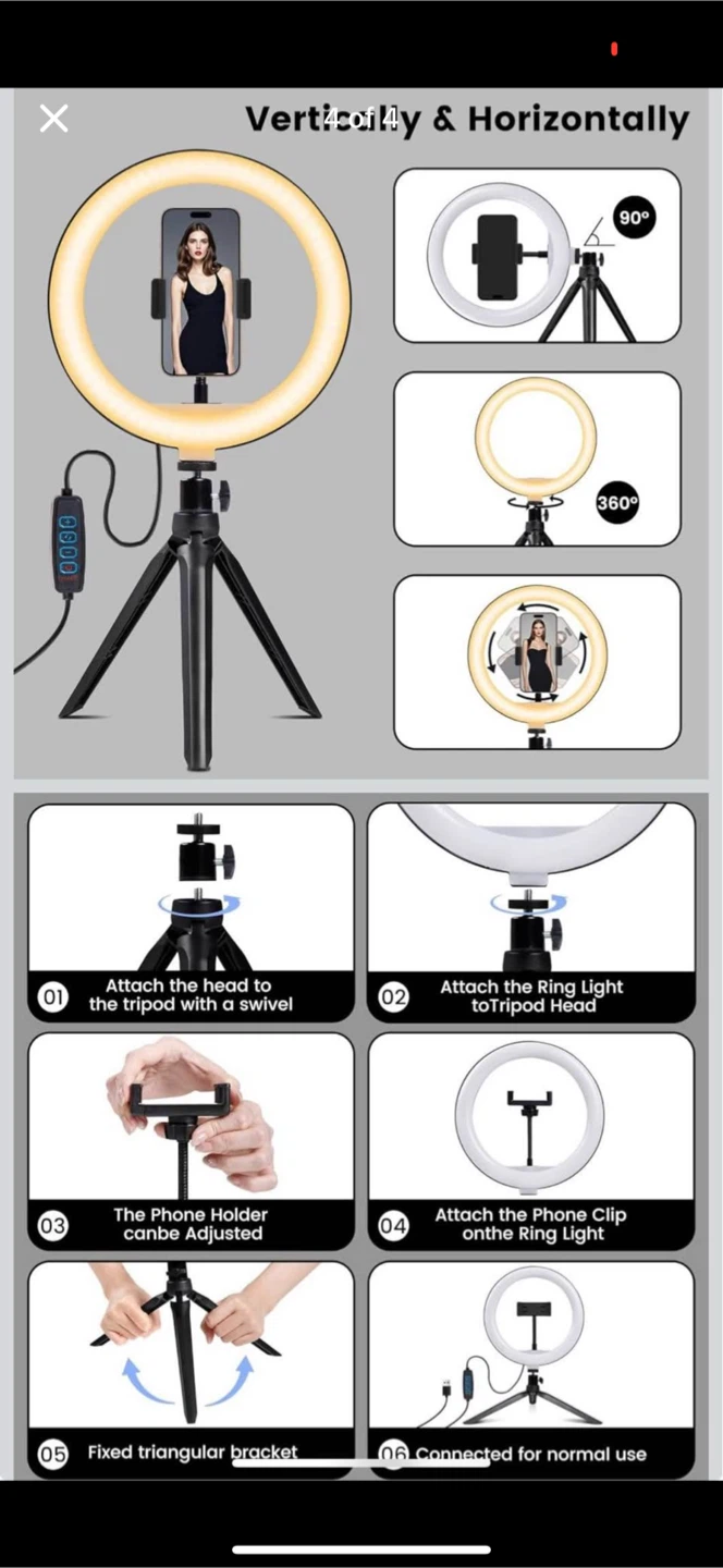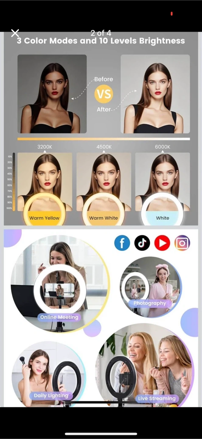 Get the perfect lighting for your online meetings, photography, daily lighting, and live streaming with this LED ring light! It features three color modes (Warm Yellow, Warm White, and White) and 10 levels of brightness to suit your needs. The phone holder is adjustable, and the light can be used vertically or horizontally. The set includes a tripod stand and a USB cable with controls