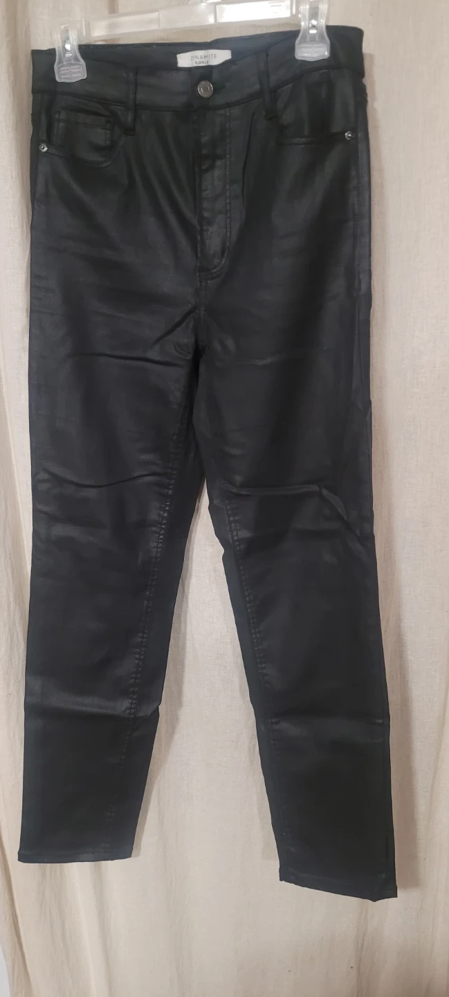 These are a pair of Dynamite Rosie jeans in black. They have a coated finish, giving them a leather look. Great for a night out or dressing up a casual outfit! ♻️ #cleanout
