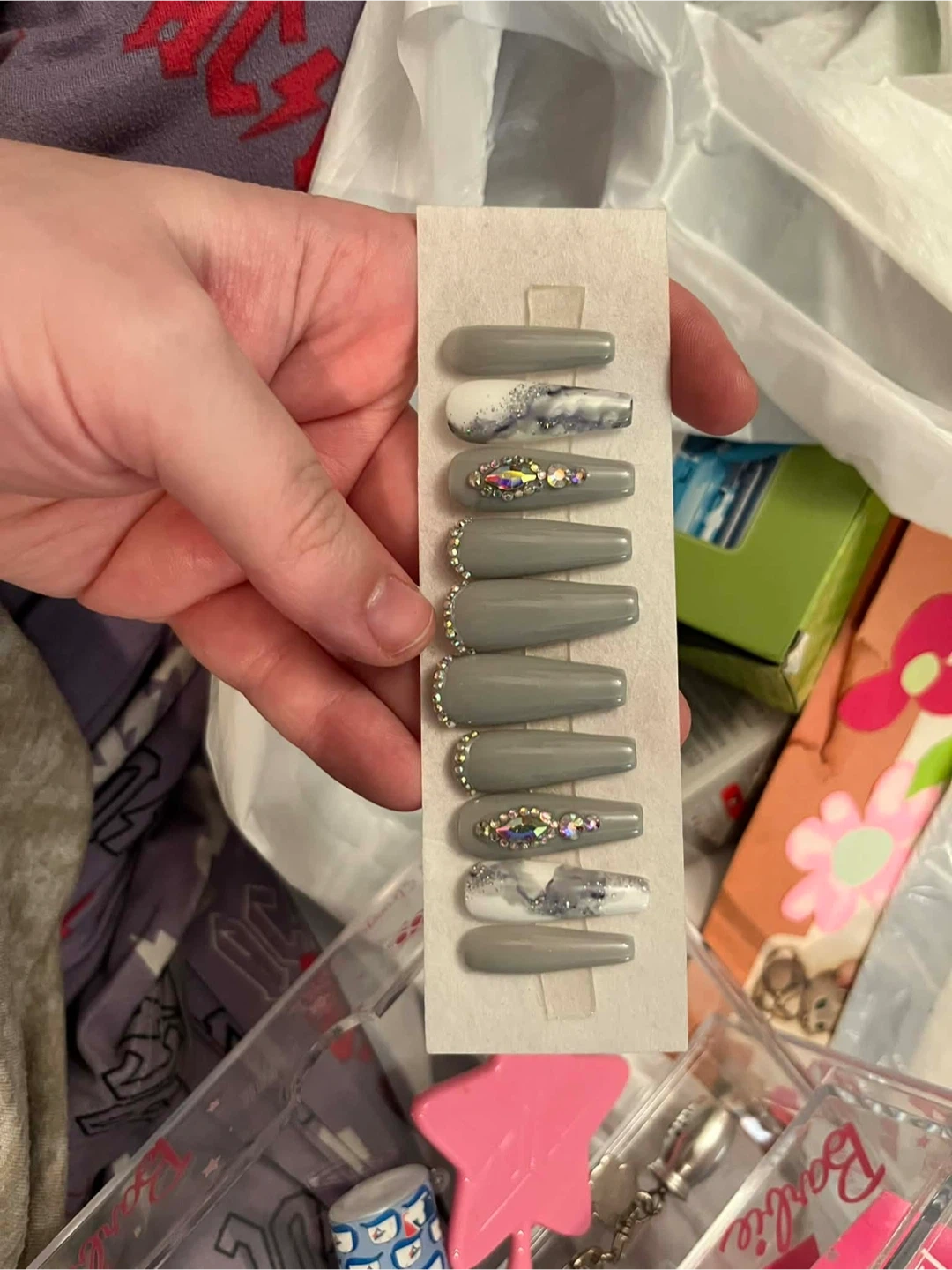 Selling a set of grey press on nails! They have some cute rhinestone details and a marble accent nail. Perfect for a night out or just to add some sparkle to your day