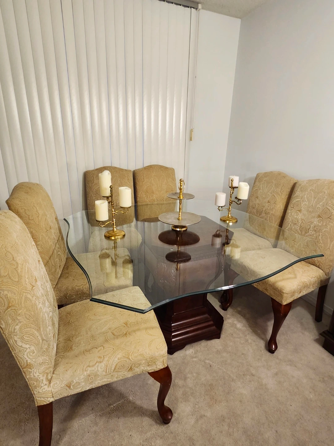 The table has a glass top and a decorative wood base. It's from Bombay company, in very good condition it would be a great addition to any dining