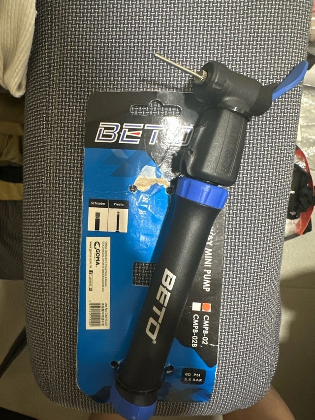 10This is a Beto mini pump, perfect for inflating tires on the go with its compact design and 80 PSI capacity. The pump is in used condition and ready for your next ride. It's designed for both Schrader and Presta valves, making it versatile for different bikes. Here are some details about the pump: * Brand: Beto * Type: Mini Pump * Max Pressure: 80 PSI / 5.5 Bar * Valve Compatibility: Schrader and Presta * Model: CMPB-02 / CMPB-02B If the ad is up, it's available!