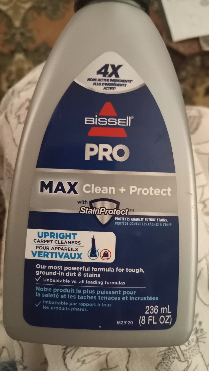 Selling a bottle of Bissell Pro Max Clean + Protect carpet cleaner for upright carpet cleaners. This formula is designed for tough, ground-in dirt and stains, and it protects against future stains. It contains 4X more active ingredients and comes in a 236 mL (8 fl oz) bottle