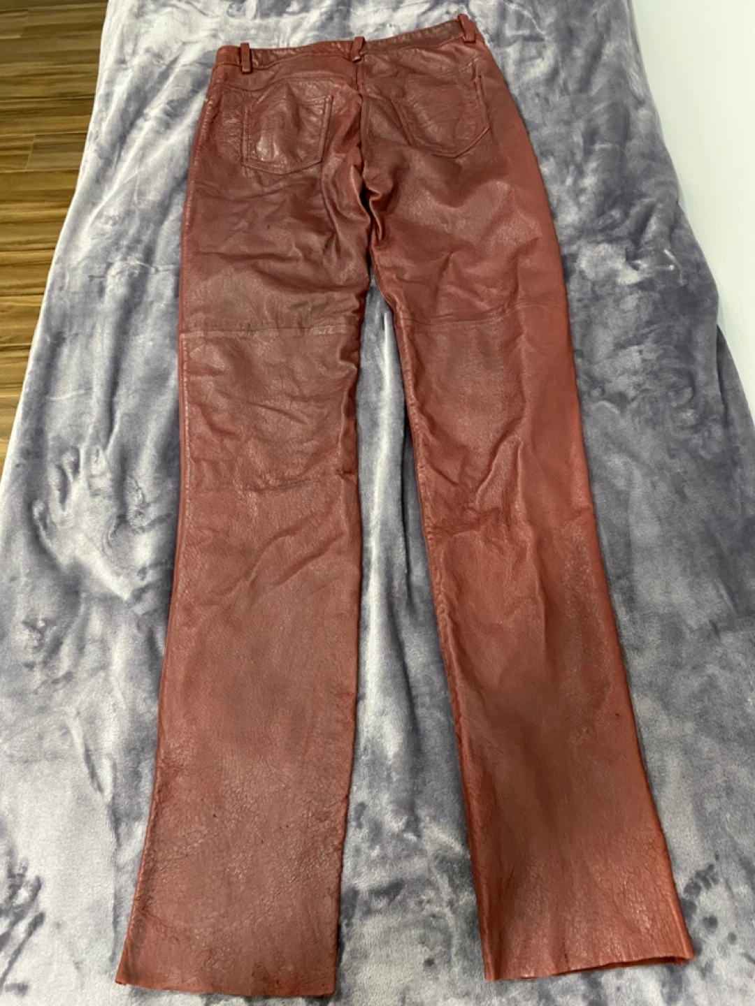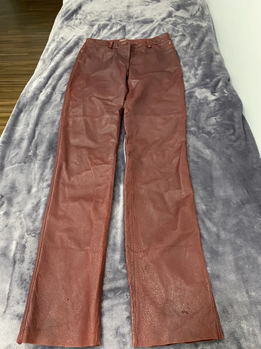 Selling a pair of Danier leather pants in burgundy. They are in good condition and ready for a new home! The material is genuine leather.