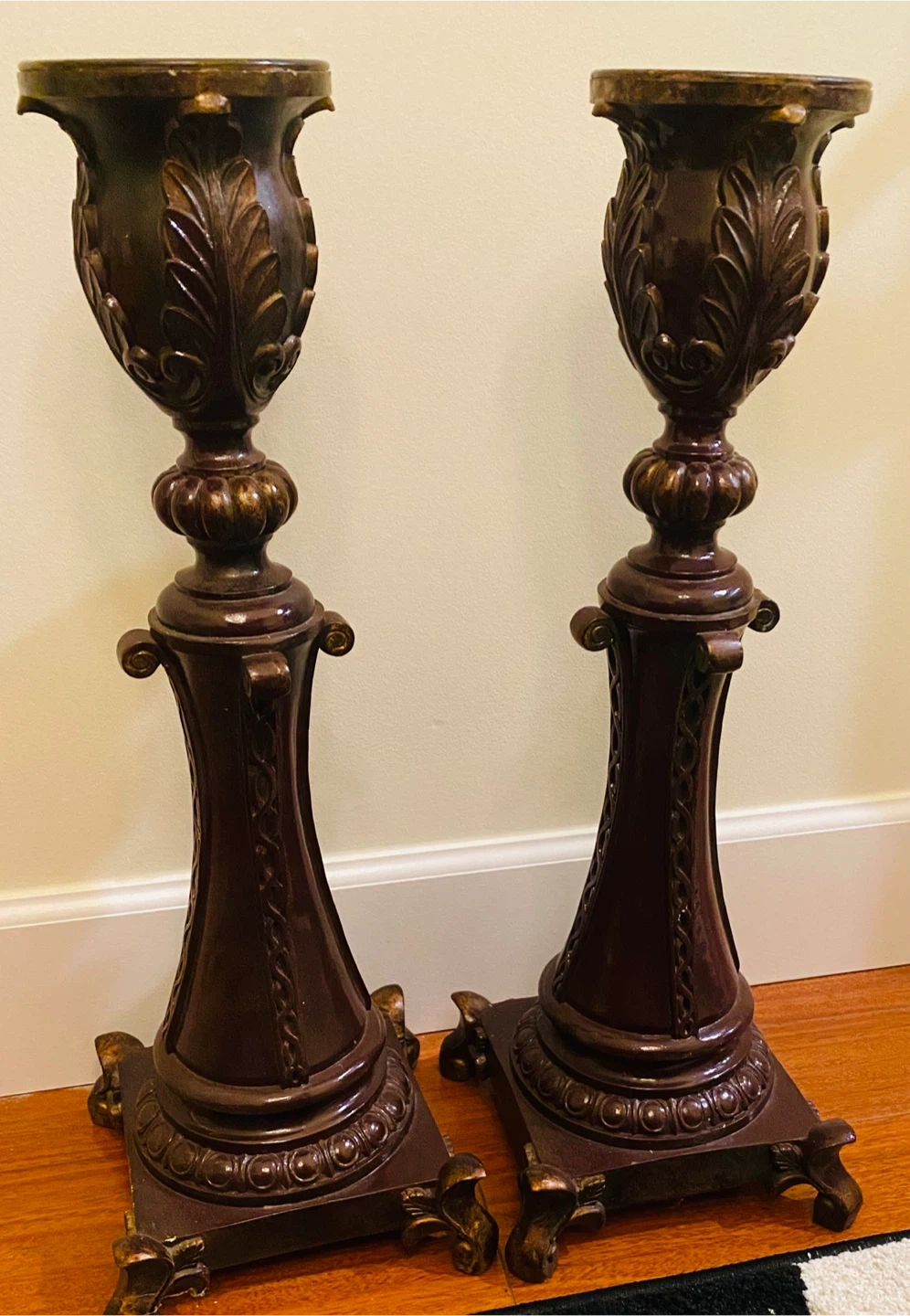 Selling a pair of decorative candlestick holders! They have a lovely brown colour with gold accents and a detailed design. They would look great on a mantelpiece or as part of a table setting