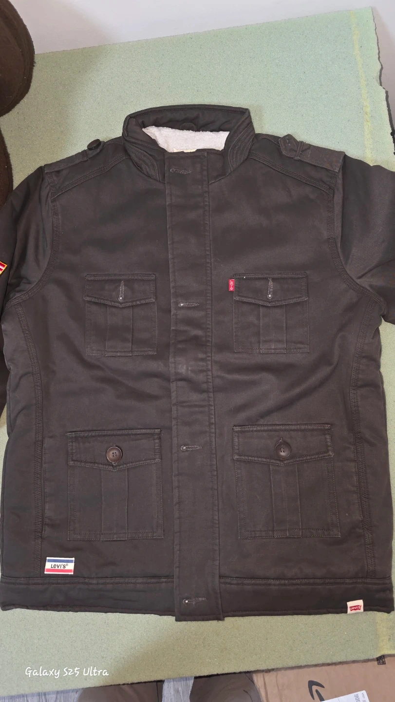 Levi's jacket in an olive green colour. It's a military style with a sherpa collar and front pockets. The jacket has an American flag patch on the left sleeve and Levi's logo on the lower left front.