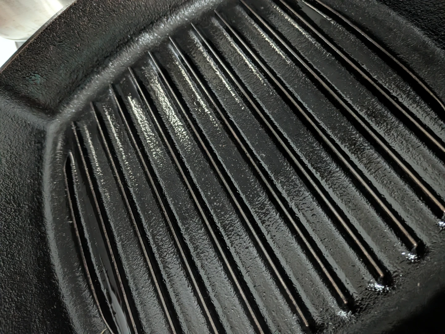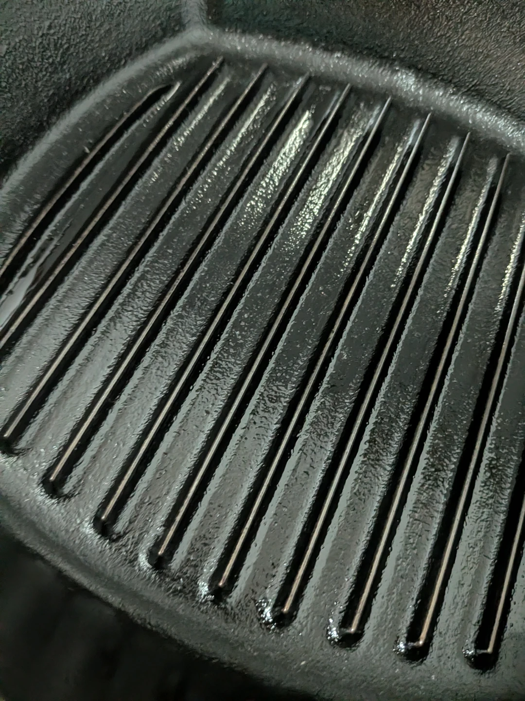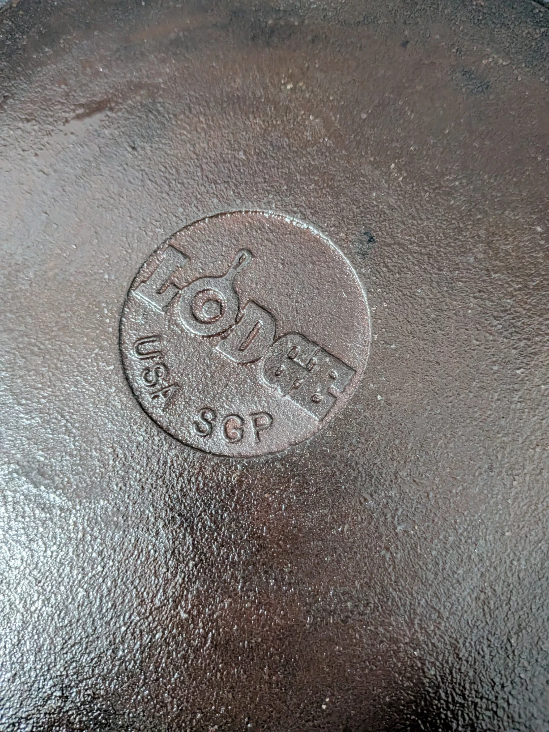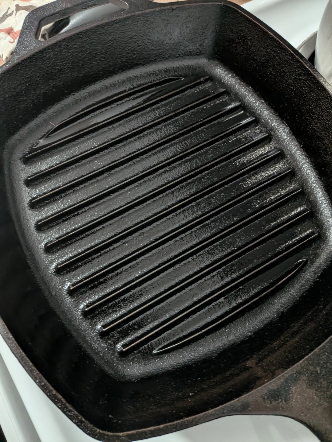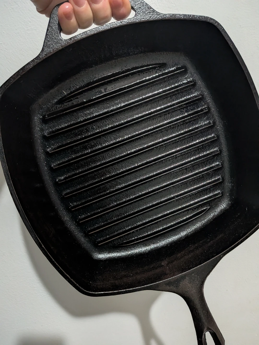 Selling a good quality cast iron grill pan in black from Lodge. It's perfect for grilling indoors and getting those nice grill marks on your food. It has some faint signs of use but is still in good condition for cooking up delicious meals!