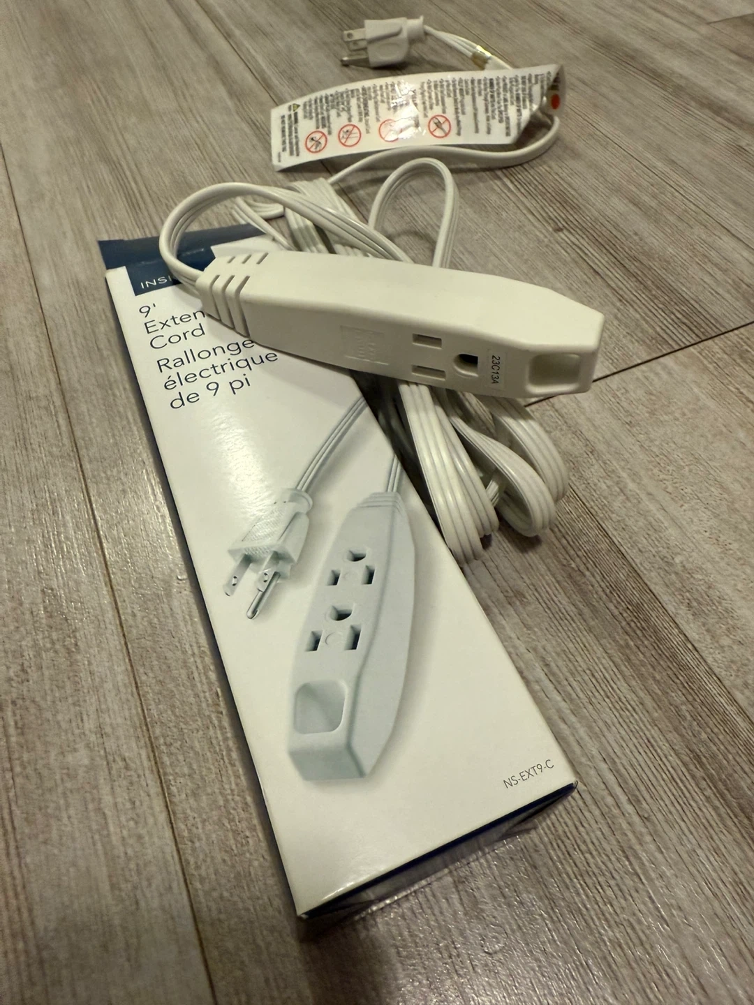 Selling an Insignia 9-foot extension cord! It's white and ready to use. Perfect for adding some extra length to your power connections around the house. Comes with the original packaging