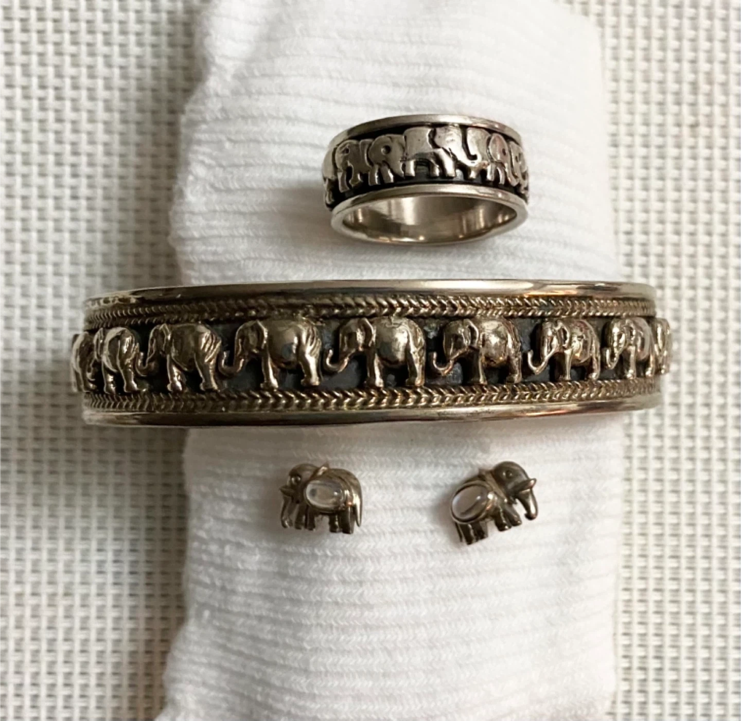 26Selling a cute 925 silver jewellery set with an elephant design! Includes moonstones a ring, a bracelet, a pendant, and a pair of earrings. The ring is size 8. The pieces are in great condition and would make a lovely addition to any jewellery collection.