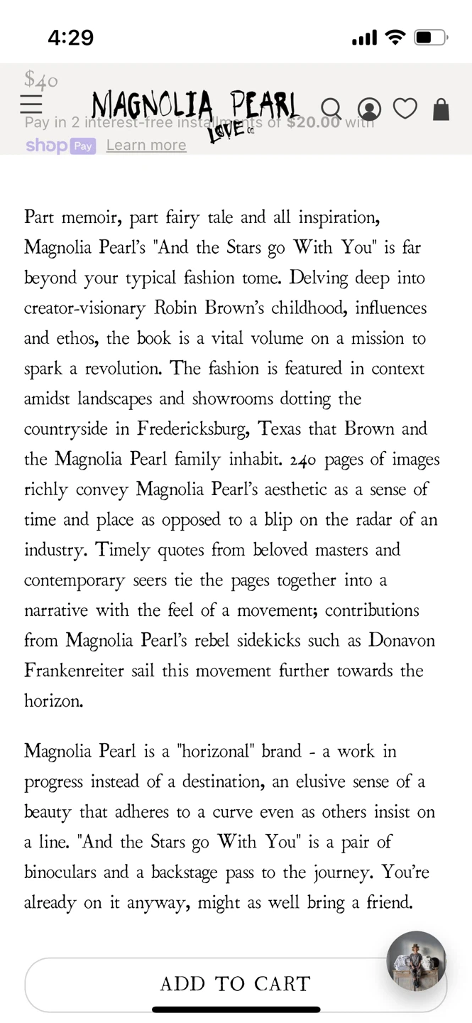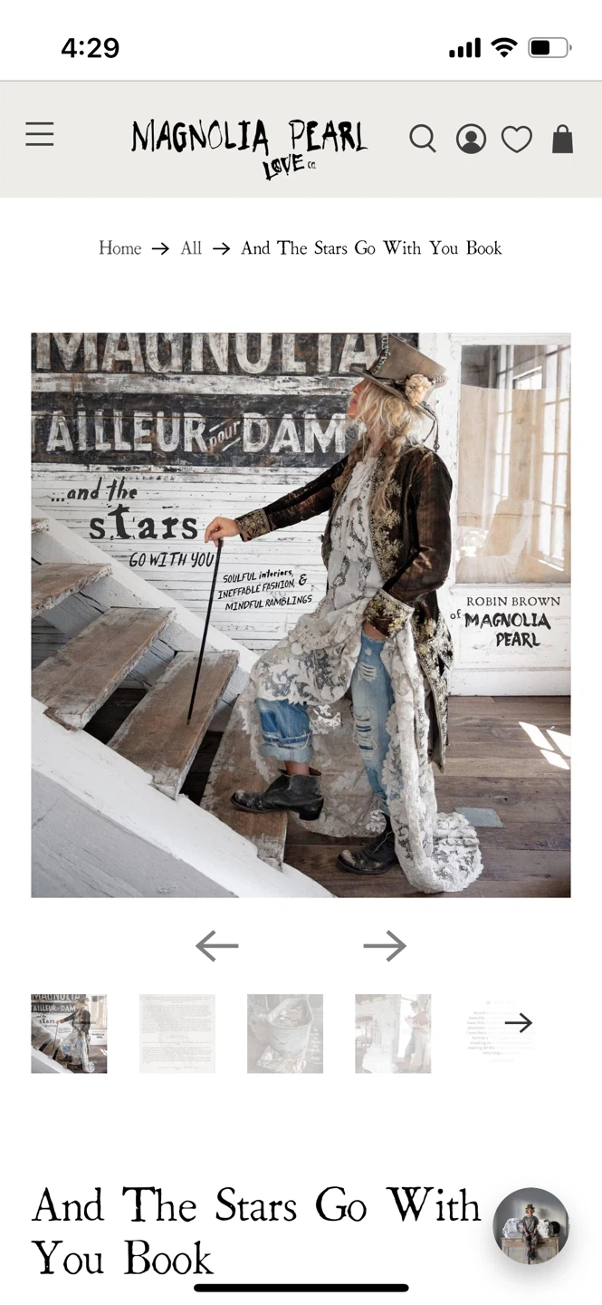 Selling Magnolia Pearl's "And The Stars Go With You" book! It's a part memoir, part fairy tale, and all inspiration. Delving deep into creator-visionary Robin Brown's childhood, influences and ethos, the book is a vital volume on a mission to spark a revolution. The fashion is featured in context amidst landscapes and showrooms dotting the countryside in Fredericksburg, Texas that Brown and the Magnolia Pearl family inhabit. It has 240 pages of images which richly convey Magnolia Pearl's aesthetic as a sense of time and place as opposed to a blip on the radar of an industry. Brand New.
