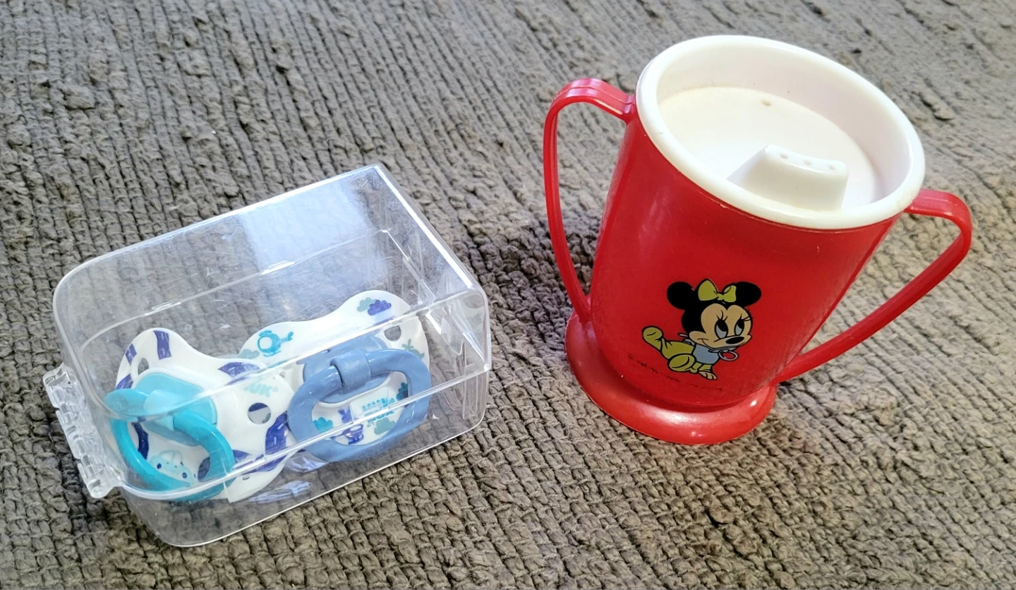 I'm selling a set of NUK pacifiers and a vintage Minnie Mouse sippy cup. The pacifiers come with a case for storage, one of them used only once. The sippy cup is in good condition, perfect for a little one!