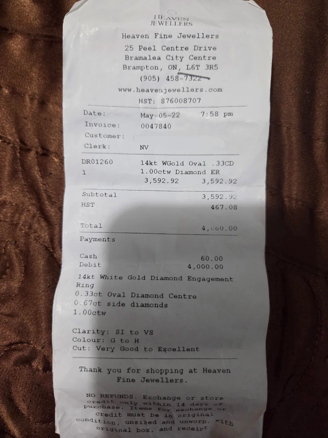 Selling a beautiful diamond ring from Heaven Jewellers. It comes with its original box for safekeeping. The ring is in perfect condition it has never been worn. Brand new. This ring was purchased three years ago. Keep in mind the price of gold has increased 50% in just one year.