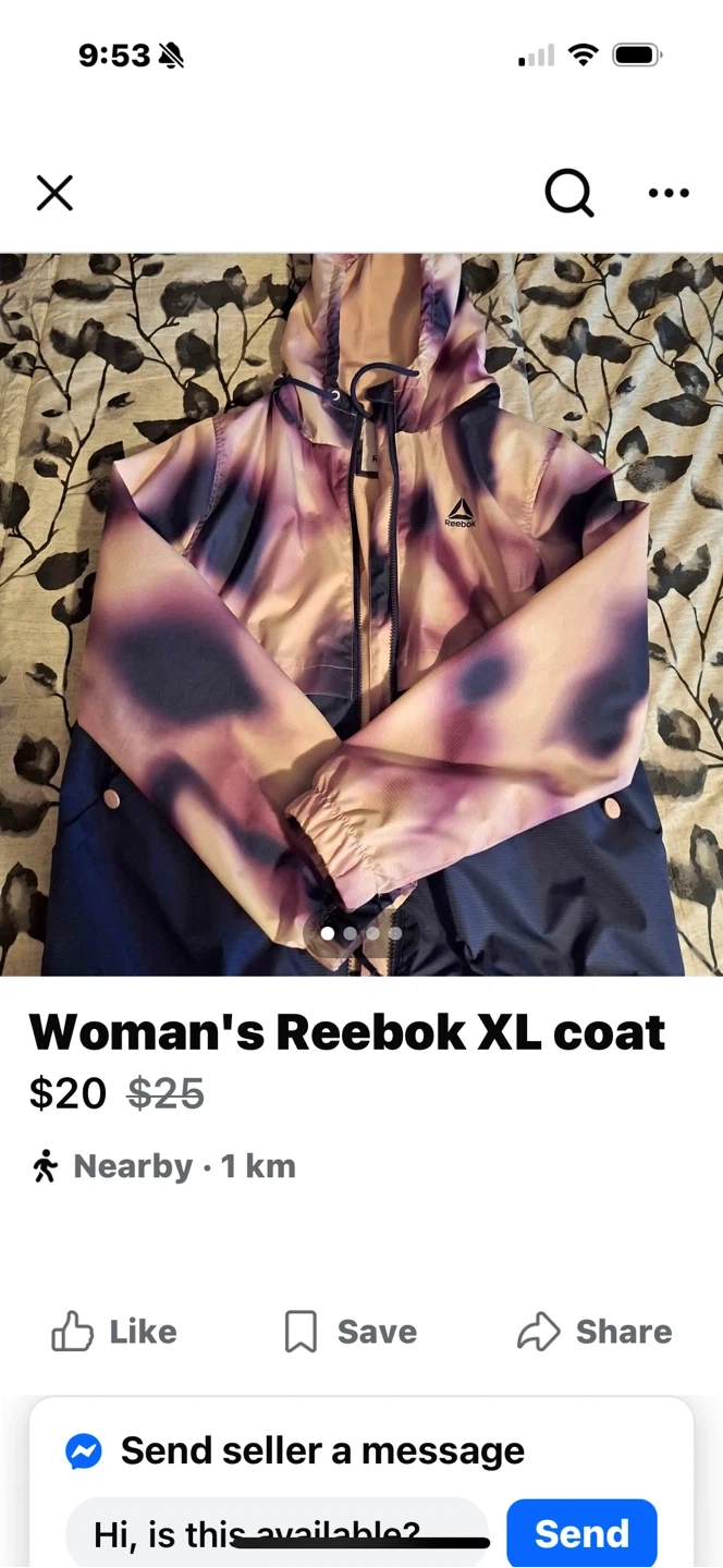 Buy & SellReebok Woman's XL CoatReebok Woman's XL Coat$20Selling a Reebok woman's coat in size XL. It looks like a great coat for spring!BrandReebokWHERE TO MEETCheck LocationView MapSELLERJennifer holdenIngersoll100 reviews0 chats·0 favorites·4 views