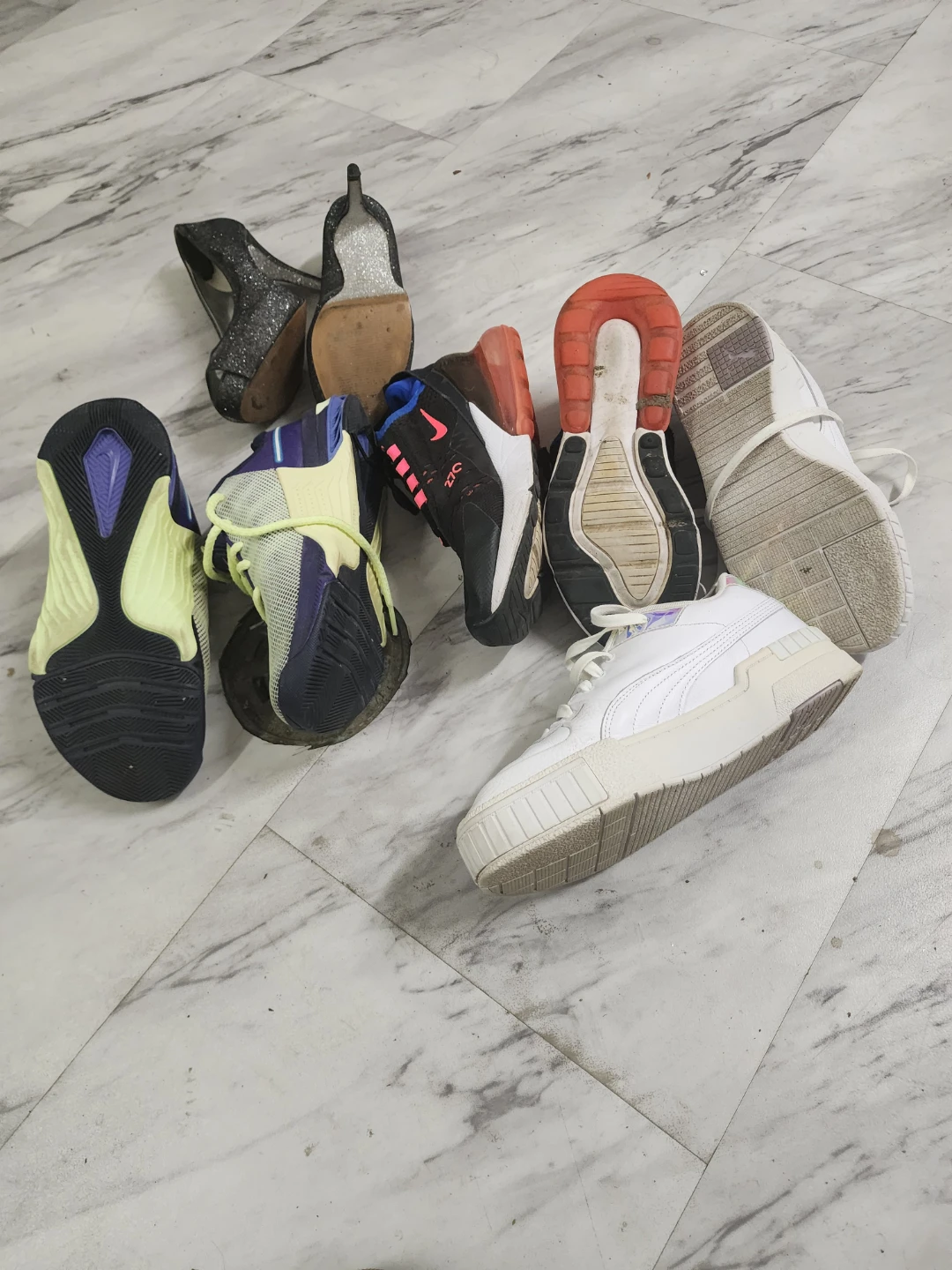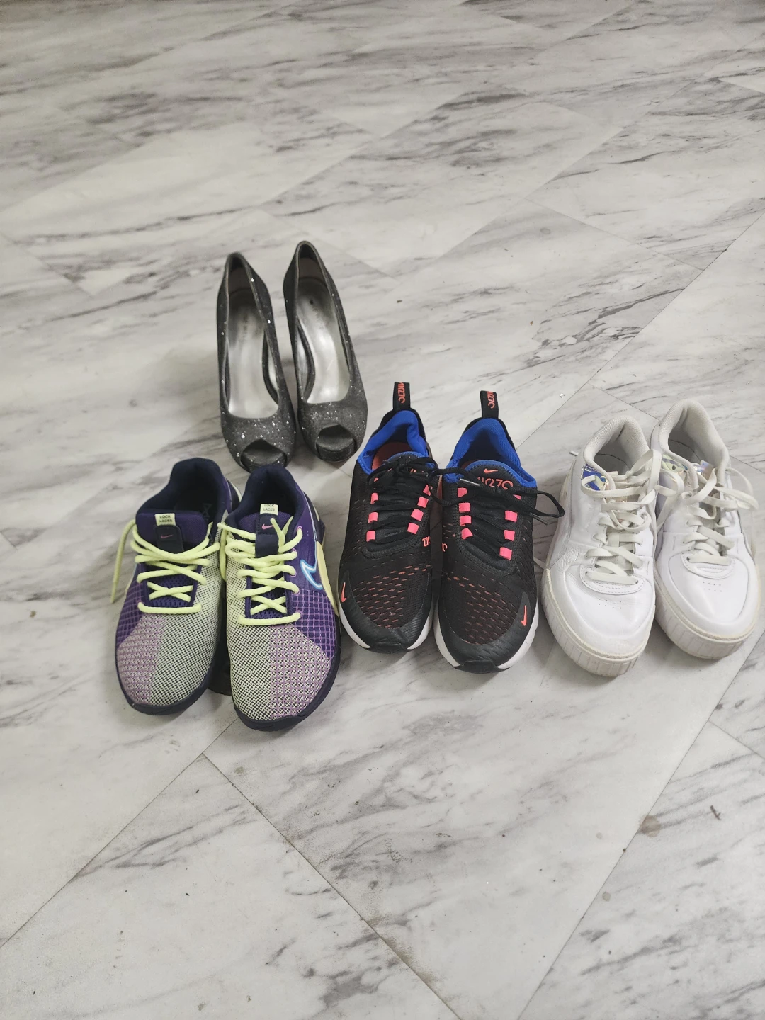 Selling a collection of gently used women's shoes. Includes a pair of black and pink Nike Air Max 270, white Puma sneakers, purple and yellow running shoes, and a pair of sparkly heels. All shoes are in used condition with some signs of wear. Please see photos for details!