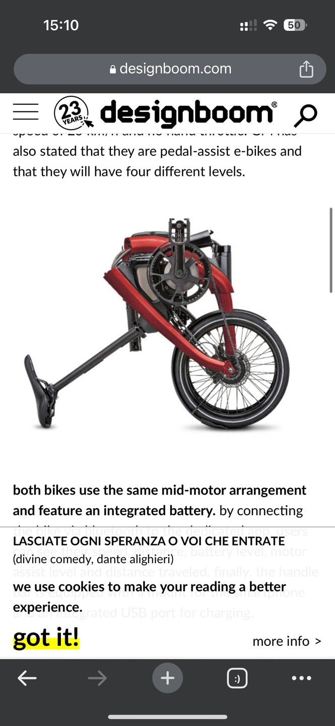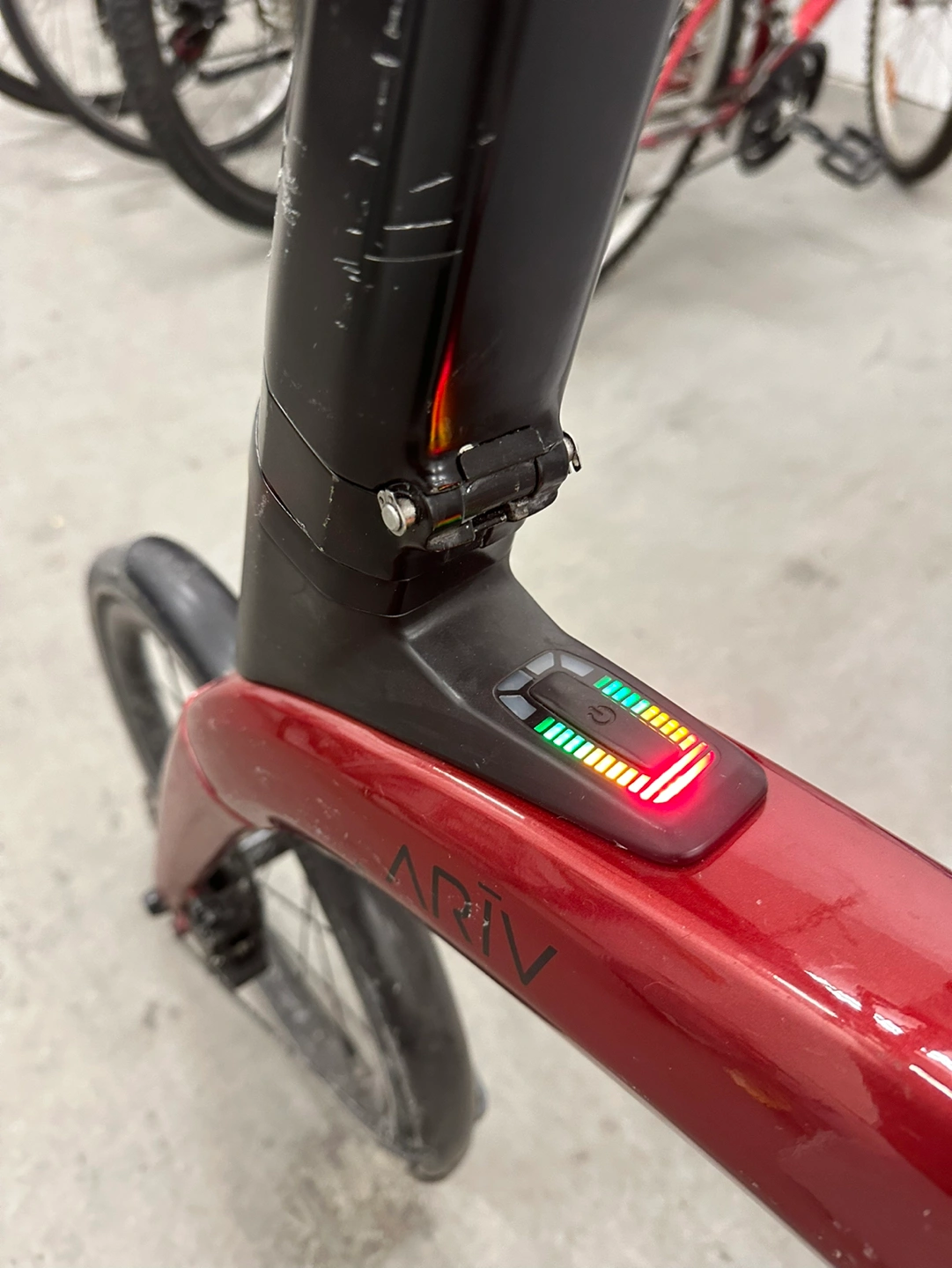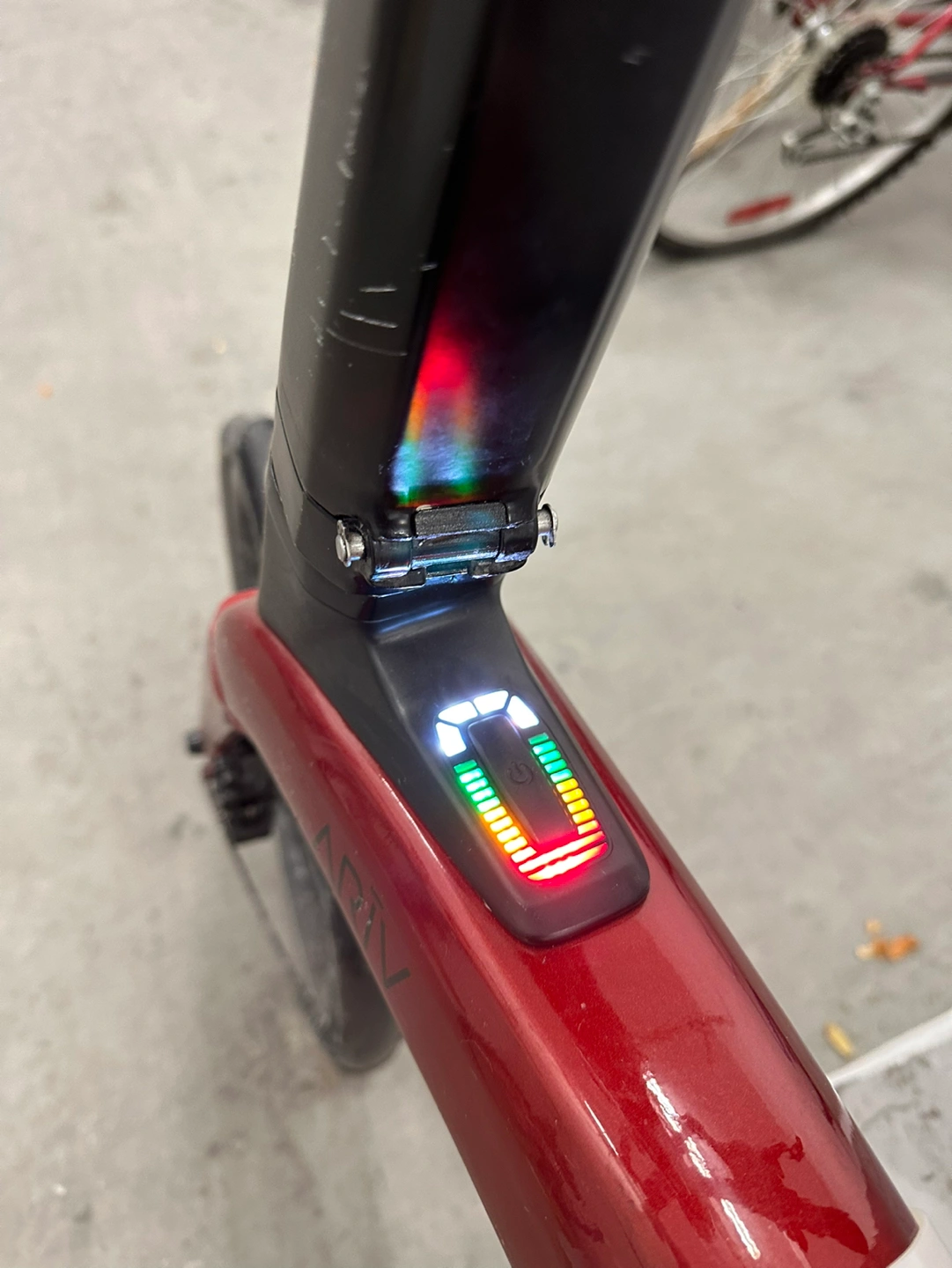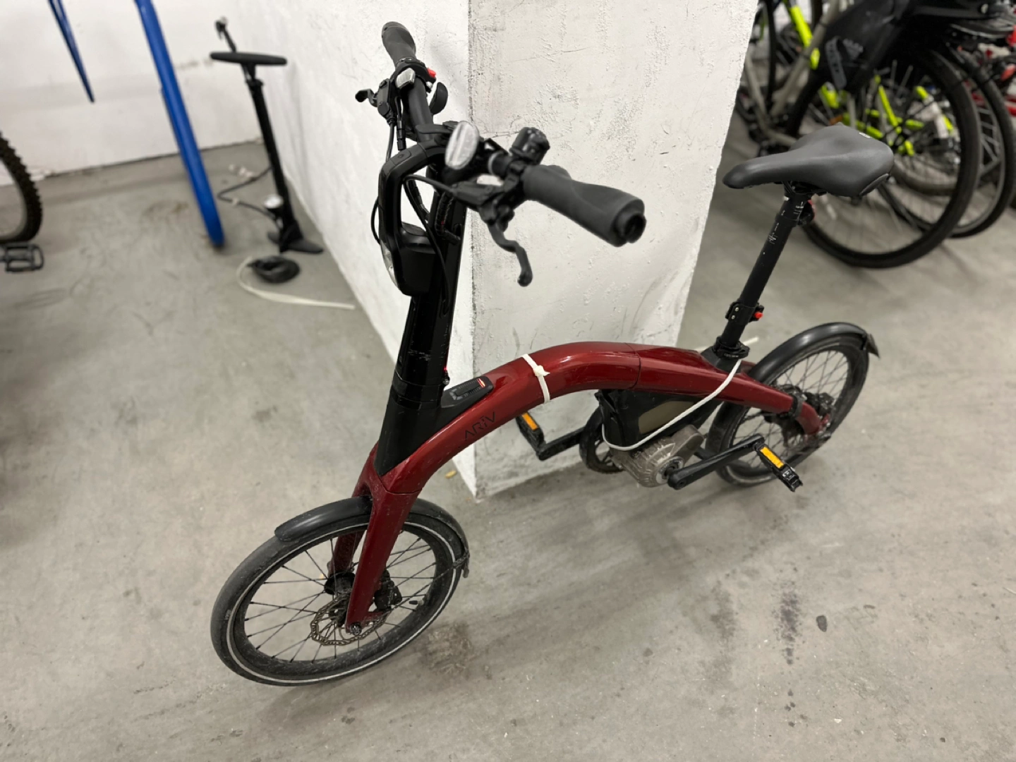 Red color foldable e-bike by General Motors called ARIV merge ebike - and got discontinued because the price point was too high (3500 euros in Europe). I was able to get one because I am a former General Motors employee and now moving to Australia but lithium batteries are not easy to fly with or even freight cargo.