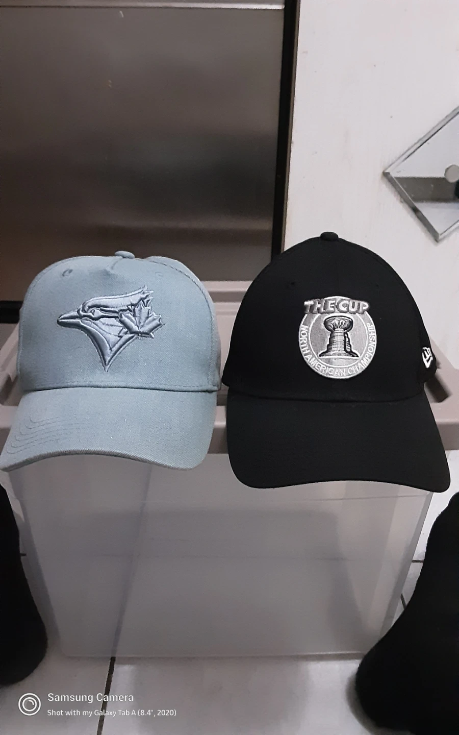 Two hats for sale! One is a light blue Blue Jays hat, and the other is a black New Era hat with 'The Cup' logo. Both are in great condition and ready for a new home