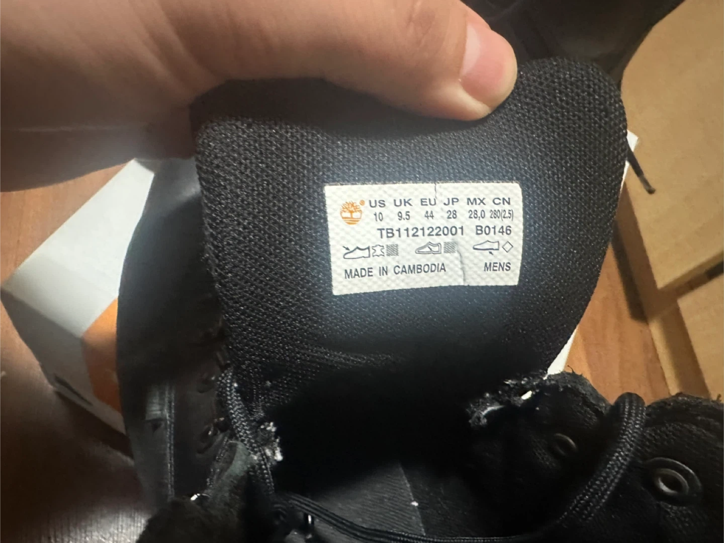 Selling a pair of Timberland boots in black. They're a US size 10, UK size 9.5, EU size 44, JP size 28.0, and MX size 28. The box is included The purchase date: this Feb