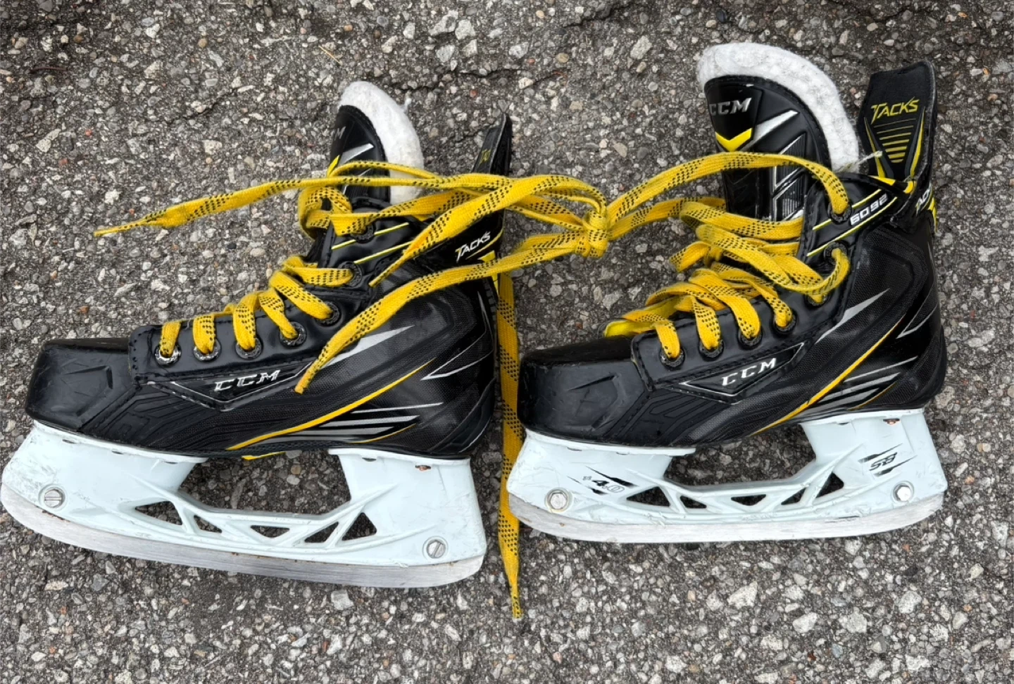 Selling a pair of CCM Tacks ice hockey skates. They are black with yellow laces and are in well worn condition - various nicks and dings. Small amt of rust on blades as shown in pic. The size is US 1.