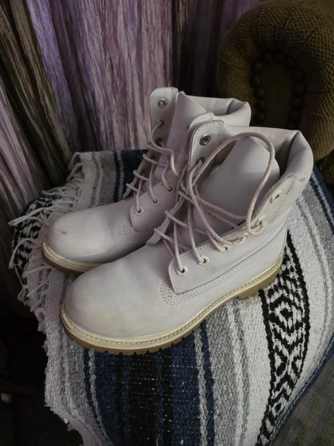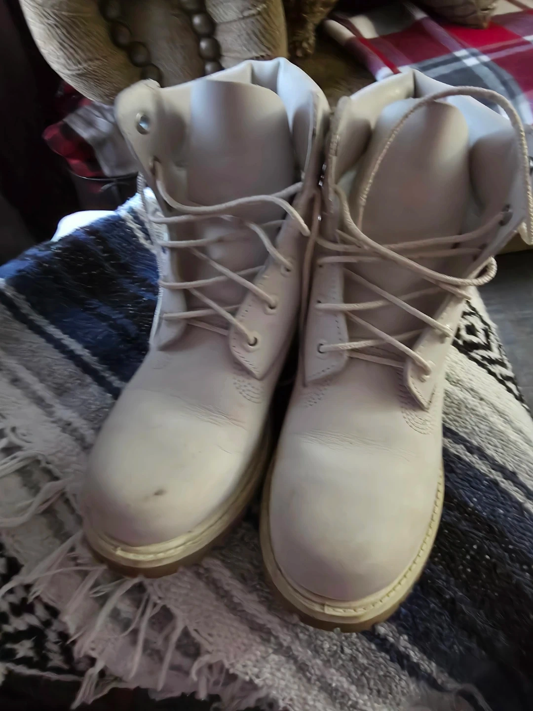 Selling a pair of Timberland boots in size 7. They're a light colour, perfect for everyday wear. They have some signs of use.