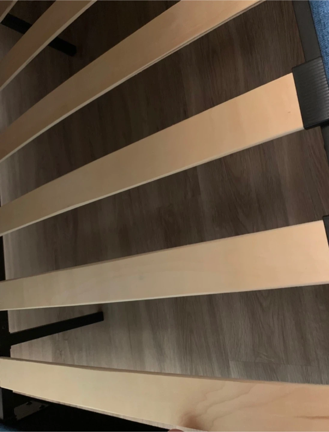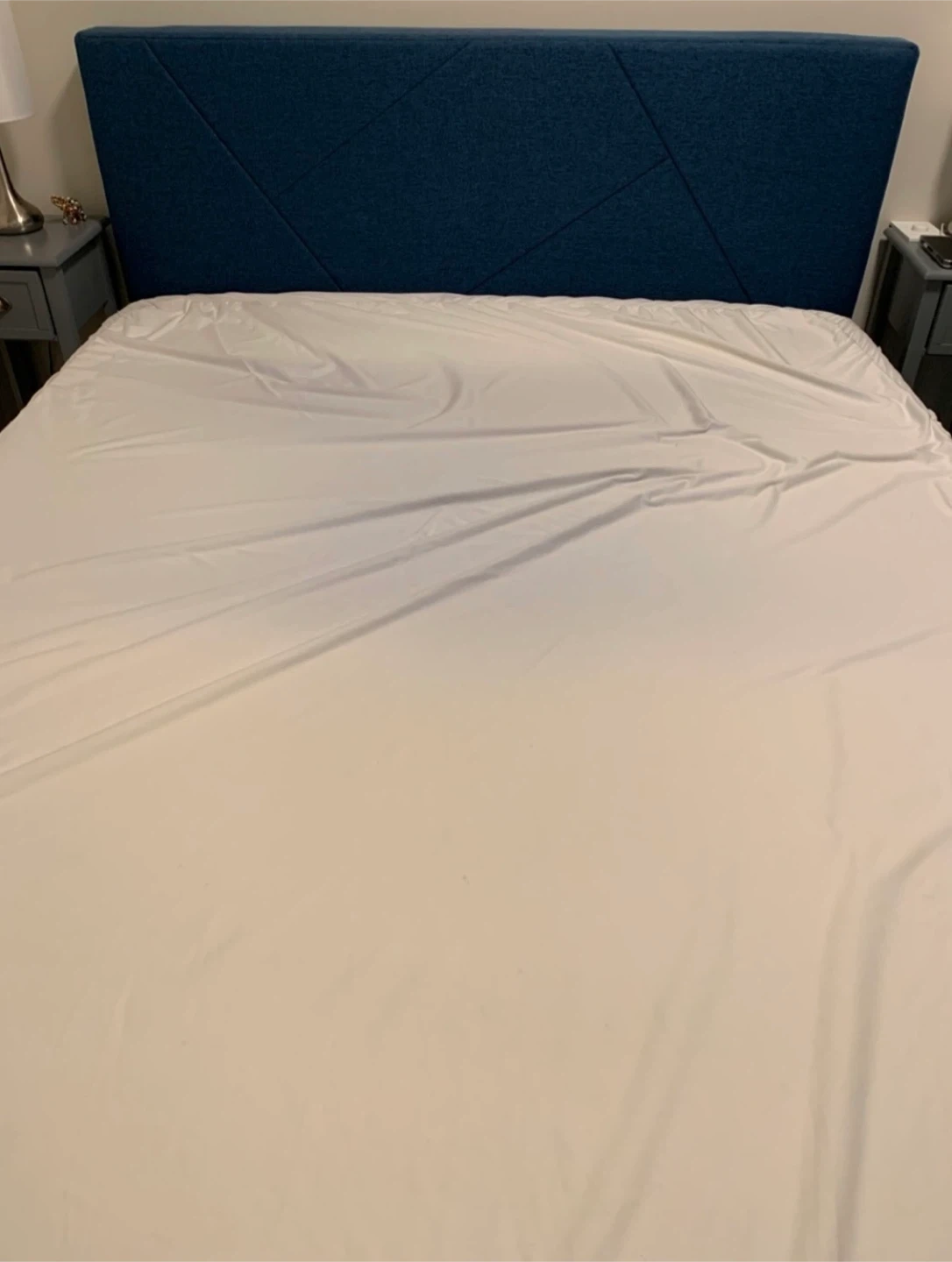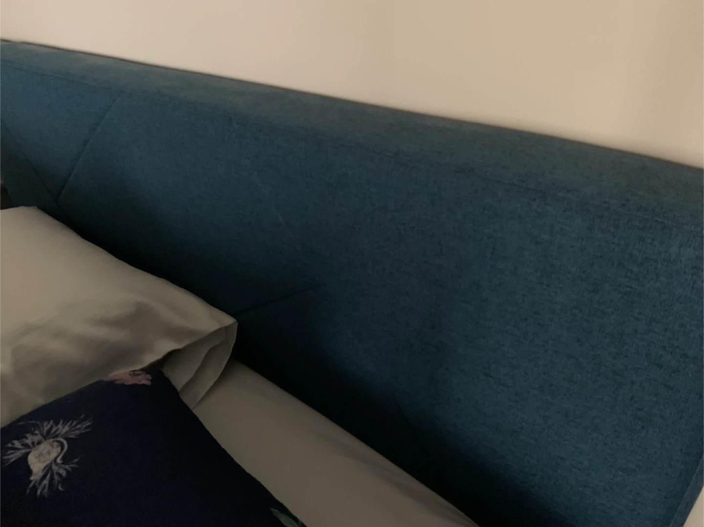 Selling a new (bought in August and slept on it for 3 days) queen-size upholstered platform bed frame with the headboard and the floral quilt. The headboard is a lovely teal/blue colour and a geometric motive. It's sturdy slat bed and provides excellent support.