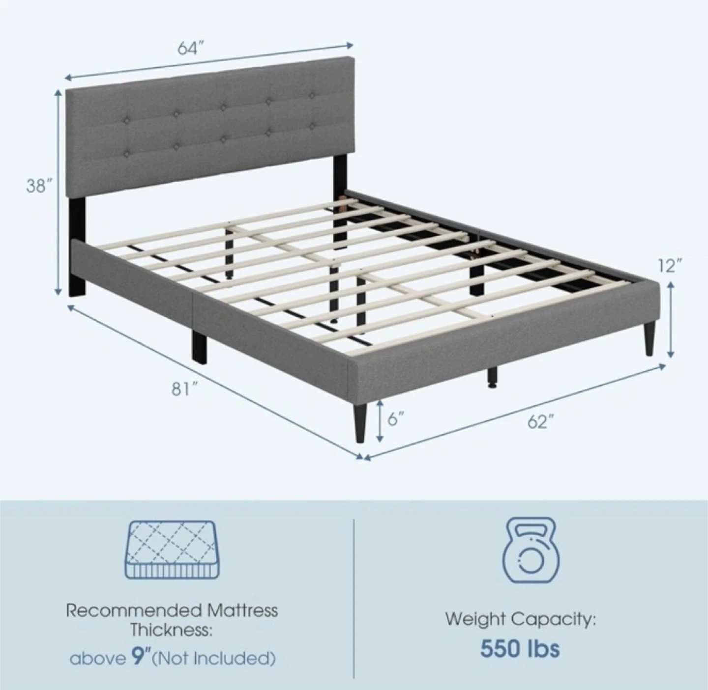 - Recommended Mattress Thickness: Above 9" (Not included)