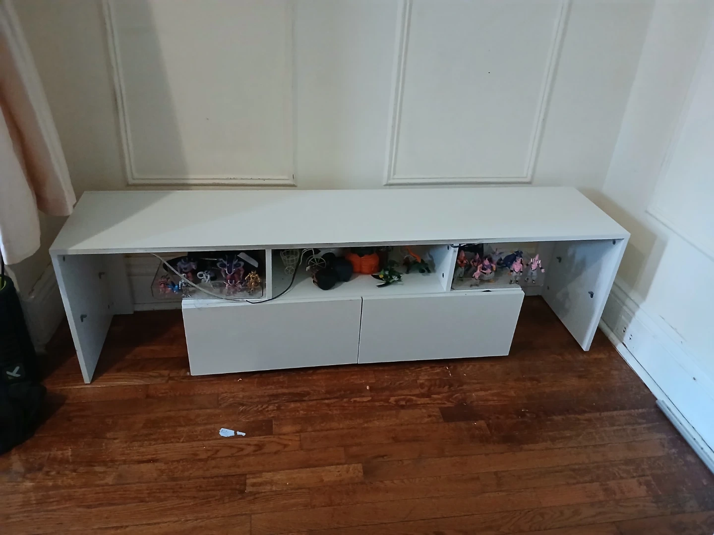Selling a white TV stand that's perfect for adding some storage to your living room! It features open shelves and drawers to keep your entertainment area organized. Great for displaying your favorite items or stashing away clutter