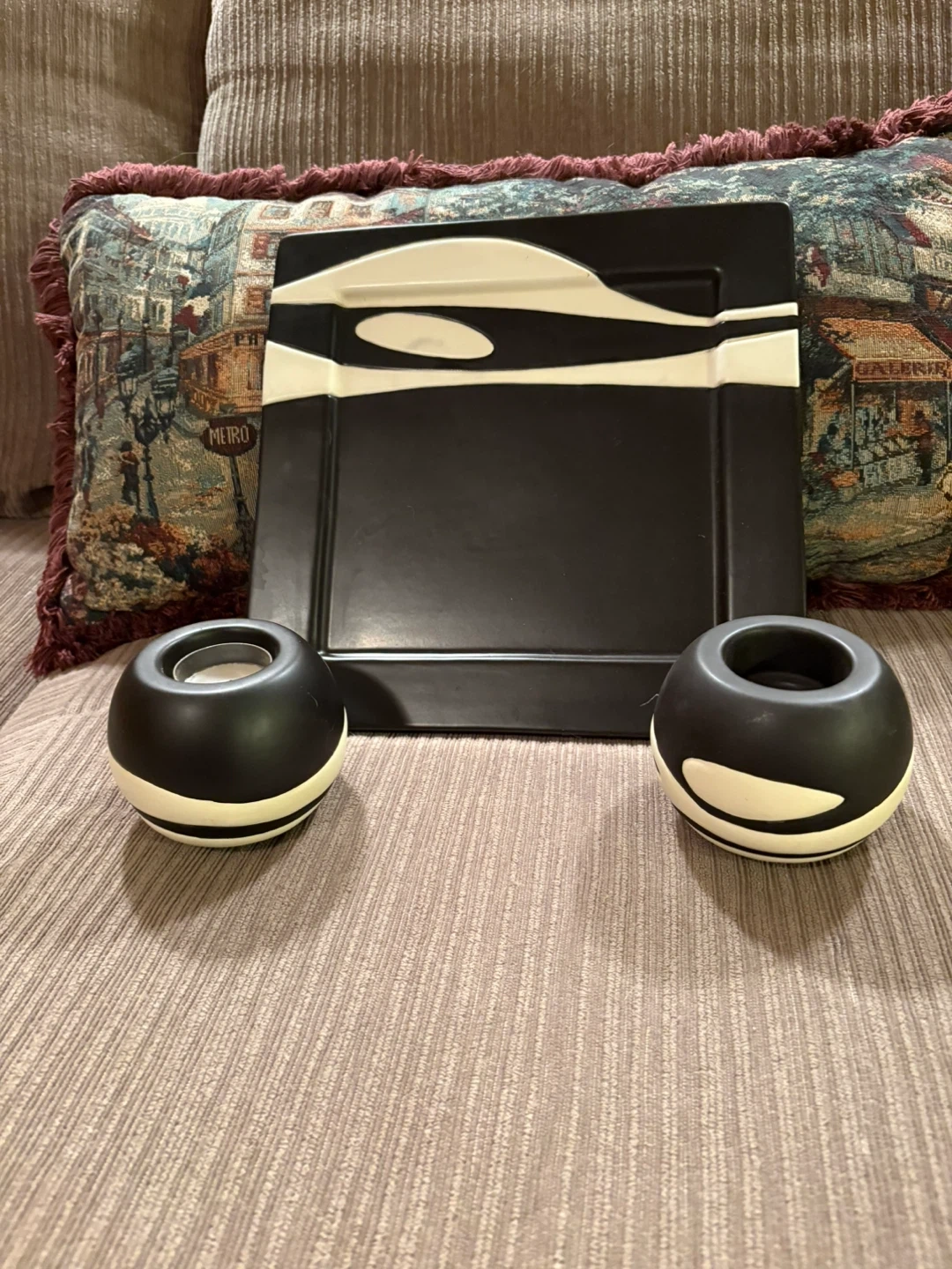 Selling a stylish black and white square plate with matching candle holders. These items would make a great addition to any home decor!